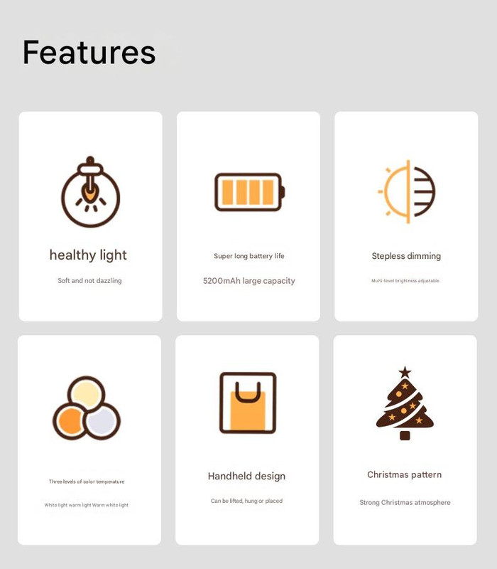 This portable LED lantern is designed to create a warm and festive atmosphere, making it suitable for holiday decorations and outdoor gatherings. It combines functional lighting with decorative appeal, featuring adjustable color temperatures and dimming options to customize your ambiance. The lantern is built with a long-lasting battery and a convenient charging method, ensuring reliable performance and portability.
