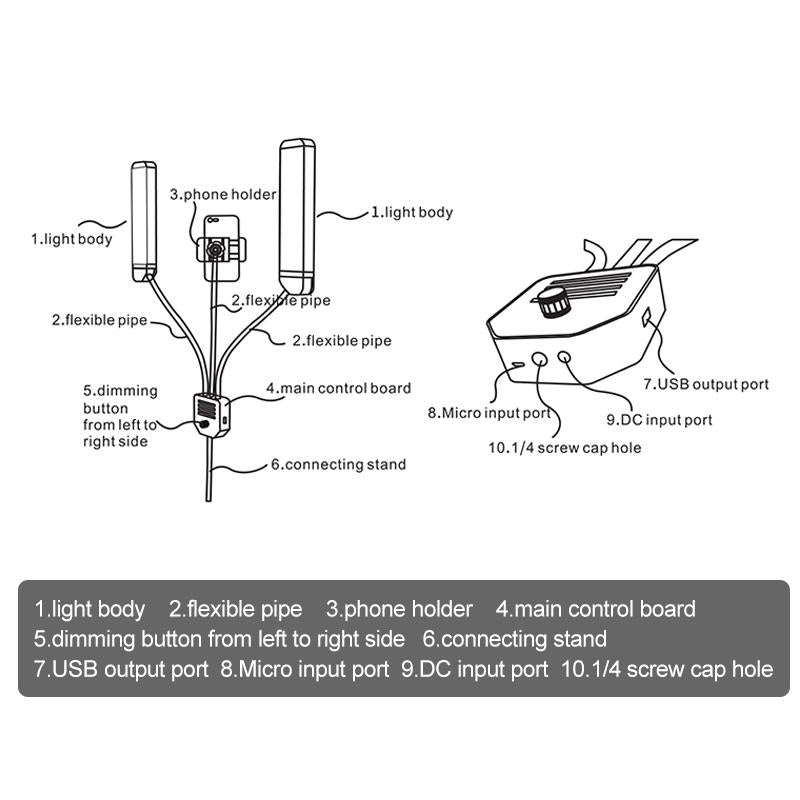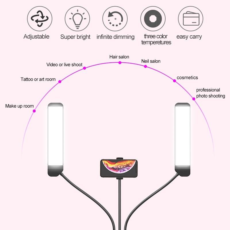 This portable double arm fill light features adjustable brightness and multiple lighting effects, making it suitable for photography, video recording, and live streaming. Its compact and lightweight design ensures easy portability and convenience for various shooting environments. Equipped with flicker-free LED beads and a high color temperature range, it provides high-quality illumination with excellent color rendering.