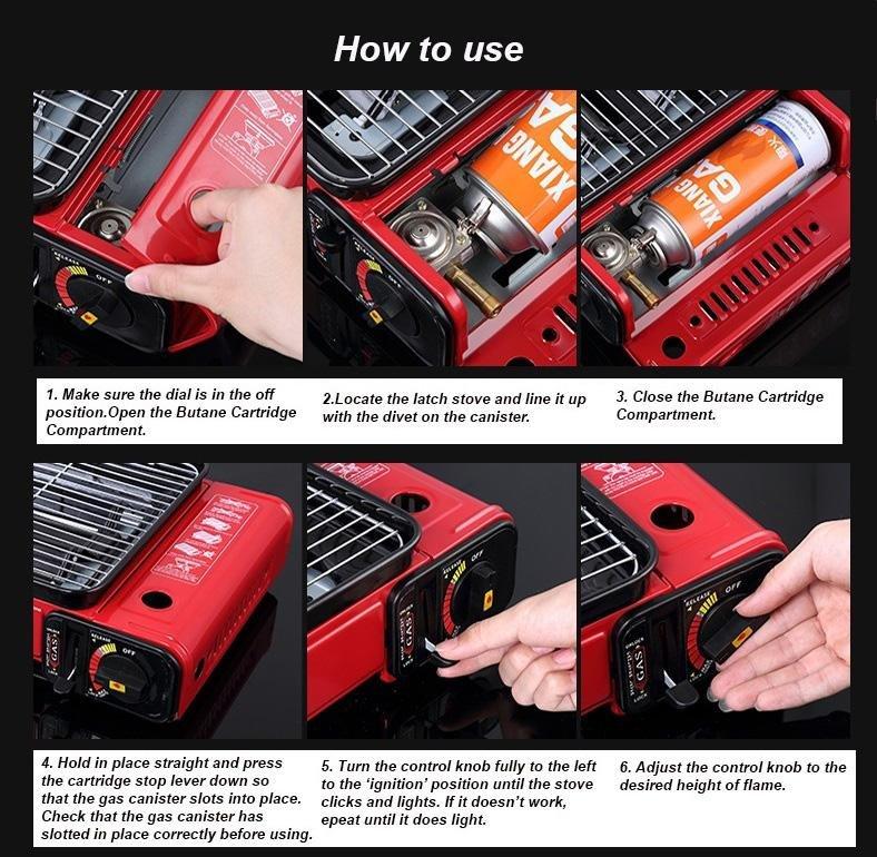 Portable Gas Stove Burner Butane BBQ Camping Gas Cooker With Non Stick Plate Red with Fish Pan and Lid