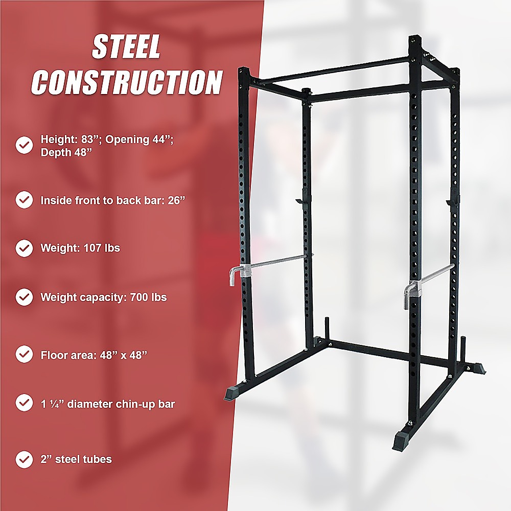 This power rack is designed to enhance your workout routine by providing a sturdy and versatile support system for various exercises. It features a wide walk-in design for comfortable movement and adjustable positions to accommodate different exercises and heights, making it suitable for a comprehensive full-body workout.