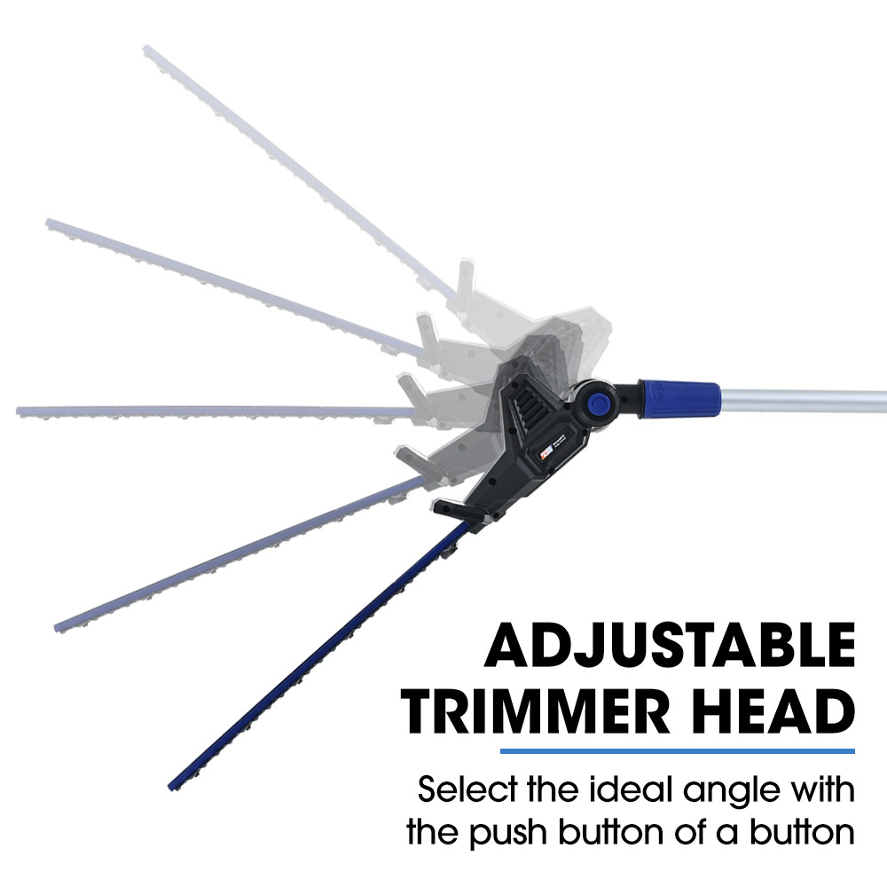 - Features an adjustable angle hedge trimmer head and extension pole for increased reach