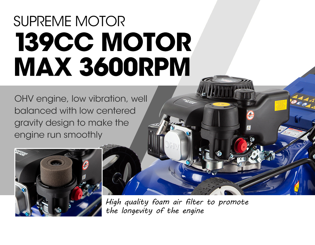 The petrol-powered push lawnmower features a robust 139cc air-cooled, 4-stroke engine, designed to handle tough grass with ease. Its compact size and maneuverability make it suitable for modern yards, providing efficient and comfortable mowing experience.