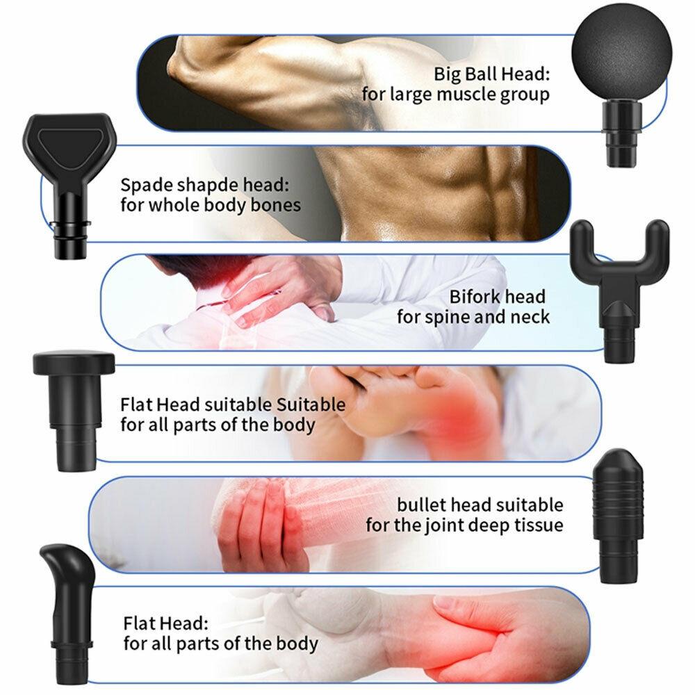 - Six massage heads for targeted therapy, including sphere, fork, hammer, and bullet shapes
