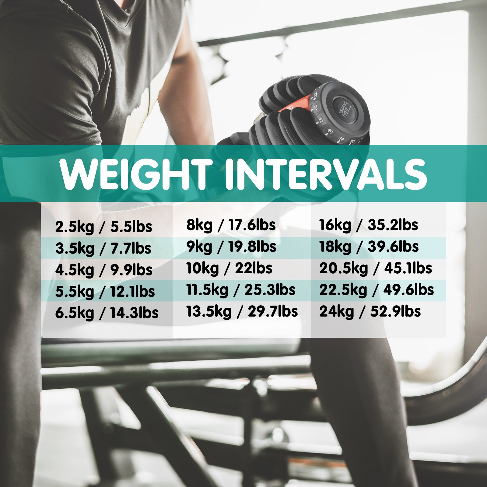 - Weight range: 5-52.5 pounds (2.3-24 kg) per dumbbell