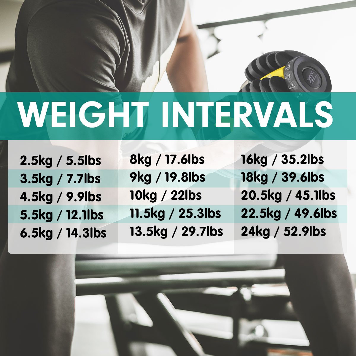 - Weight range: 5-52.5lb (2.3-24kg) each