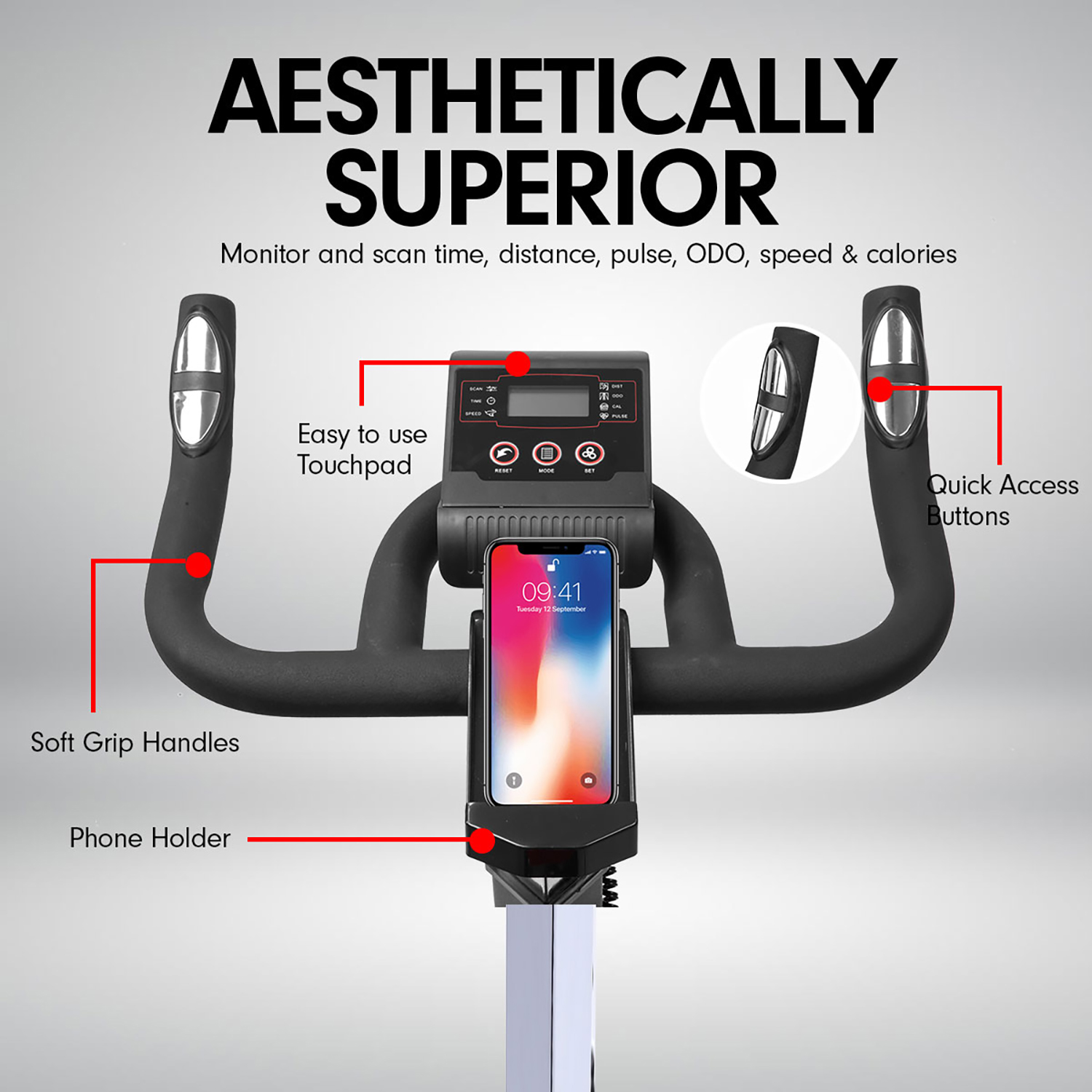 This exercise spin bike is designed with commercial-grade quality, offering smooth operation, quiet performance, and high durability for long-term use. It features an adjustable seat and handlebars to accommodate users of different sizes, and a resistance control dial to easily modify workout intensity. The bike includes a comprehensive LCD display to monitor key workout metrics, and a spring shock absorption system for a comfortable riding experience.