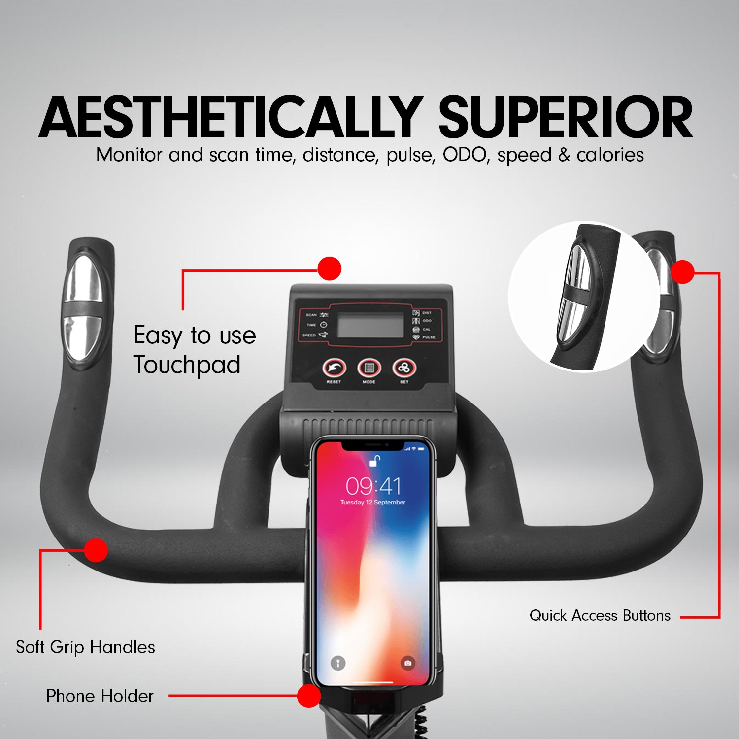 This exercise spin bike is designed with true commercial quality, offering smooth riding, quiet operation, high durability, and long-lasting performance. It features an LCD display to monitor your workout progress, including distance, speed, and calories burned. The bike’s adjustable seat and handlebars allow for a customized fit, and the resistance can be easily increased or decreased to match your fitness goals. Built with a sturdy steel frame and equipped with various safety and comfort features, it is suitable for intense cardio and speed training sessions.