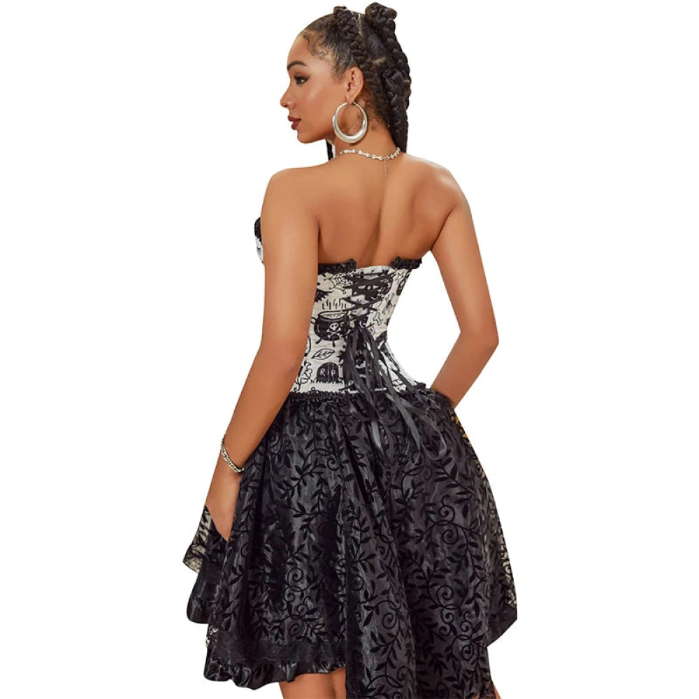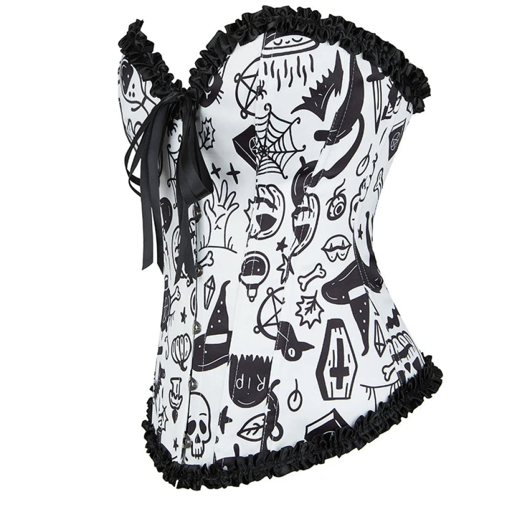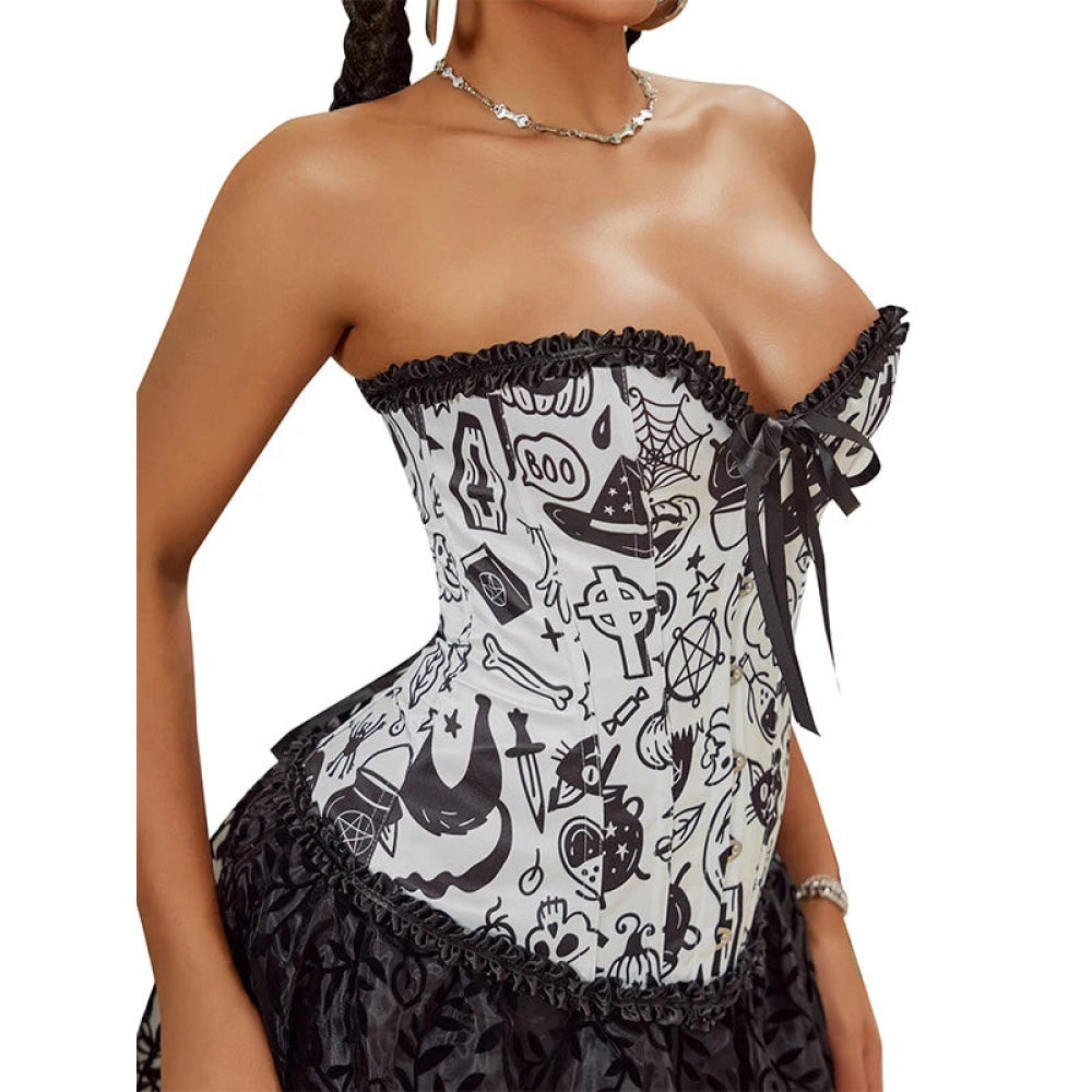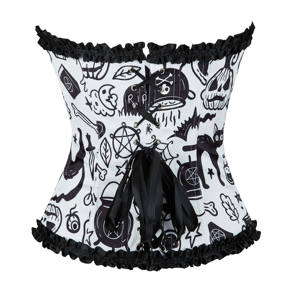 Print Gothic Corselet Ruffled Lace Trim Boned Corset Halloween Women Clothing – Xs