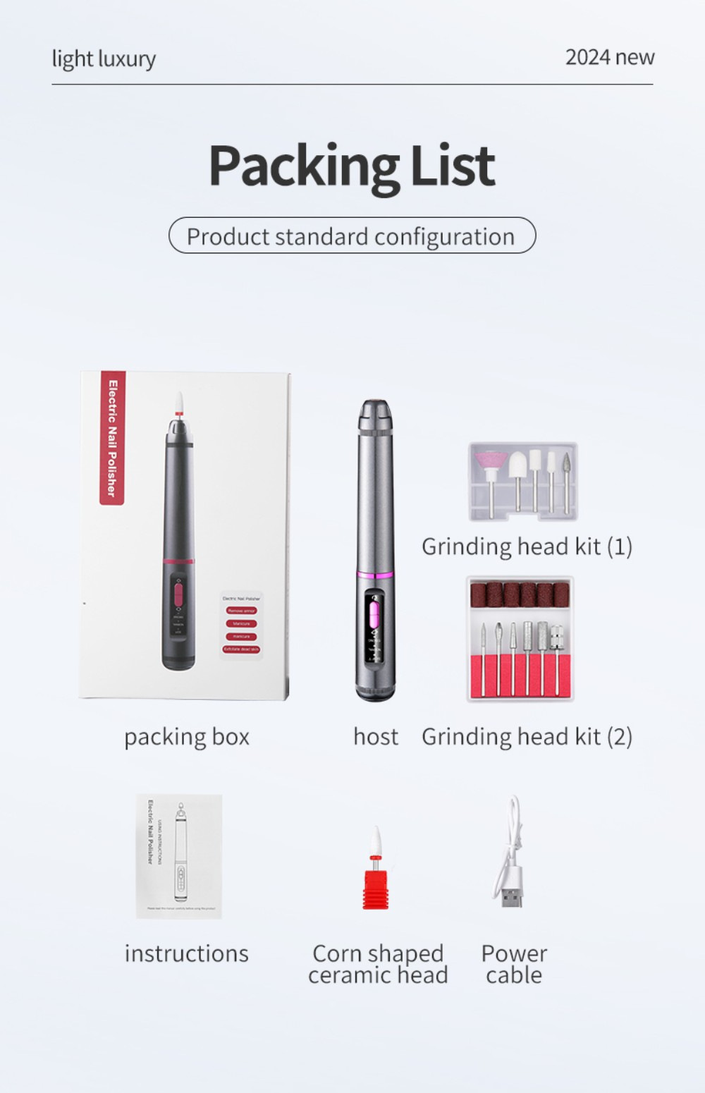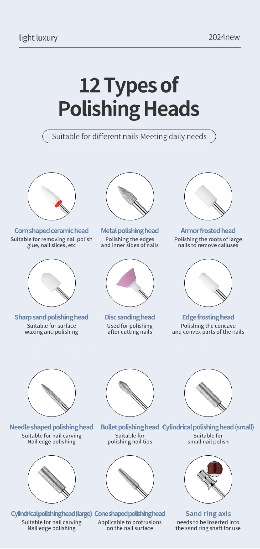 - 12-in-1 Kit: Includes various polishing and grinding heads suitable for removing polish, grinding edges, and skin care.