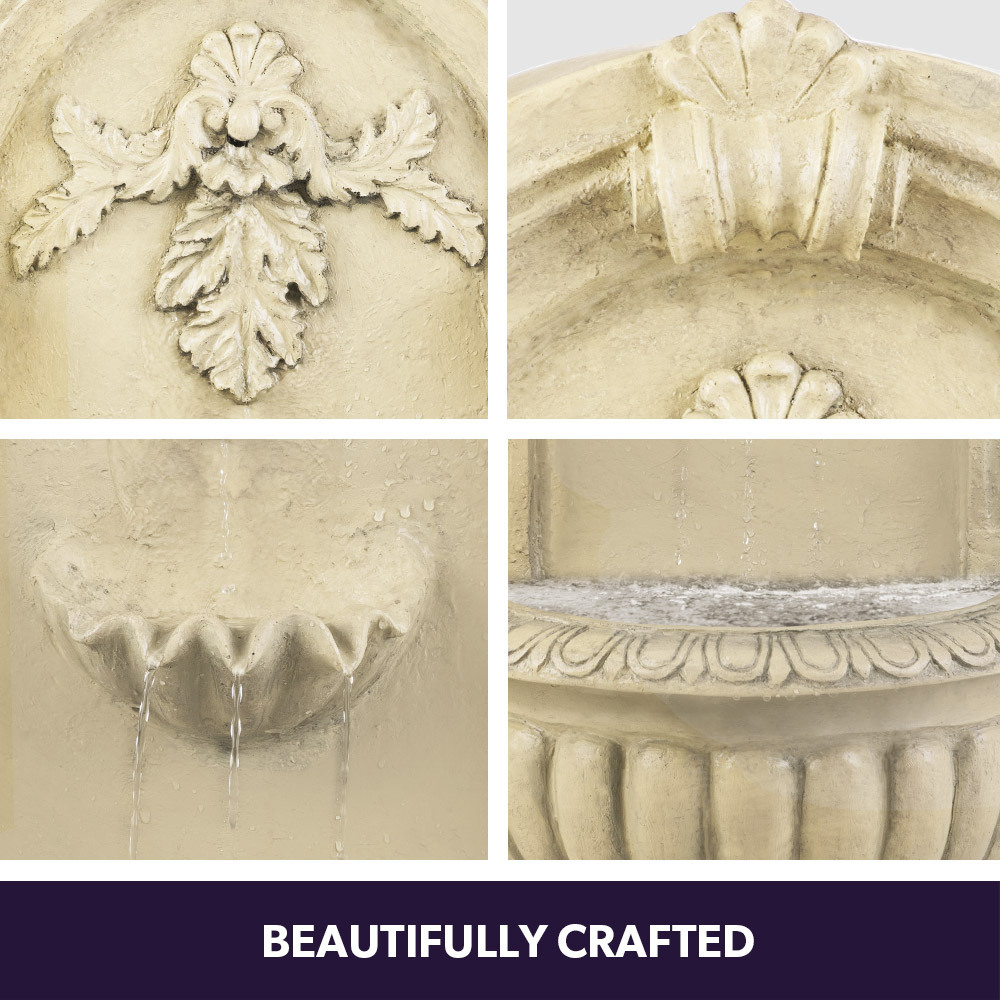 This traditional-style solar-powered water feature creates a calming focal point in outdoor spaces. Made from durable polyresin that mimics stone, it features detailed craftsmanship and can be easily mounted on a wall or placed on a surface. The fountain is designed to operate automatically, providing tranquil water flow and LED lighting to enhance your garden ambiance.