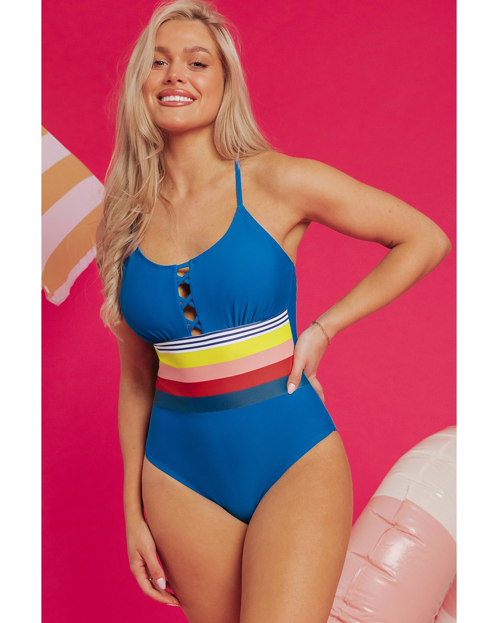 This one-piece swimwear features a striking Prussian Blue color with contrasting stripe accents and a unique crisscross design. Its stylish cutout front and backless style create a bold and attractive look, perfect for making a statement at the beach or poolside.