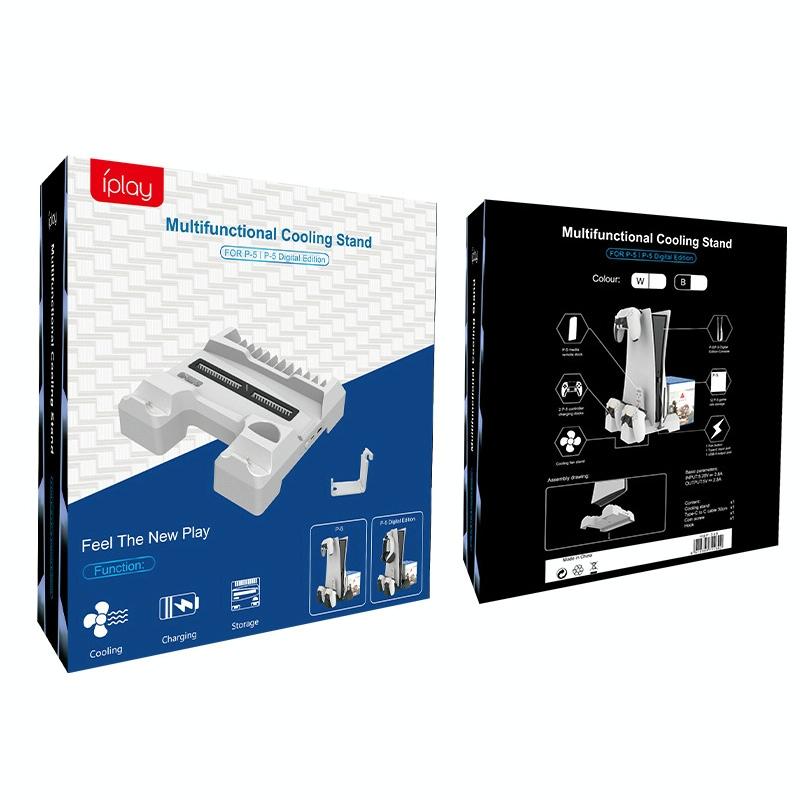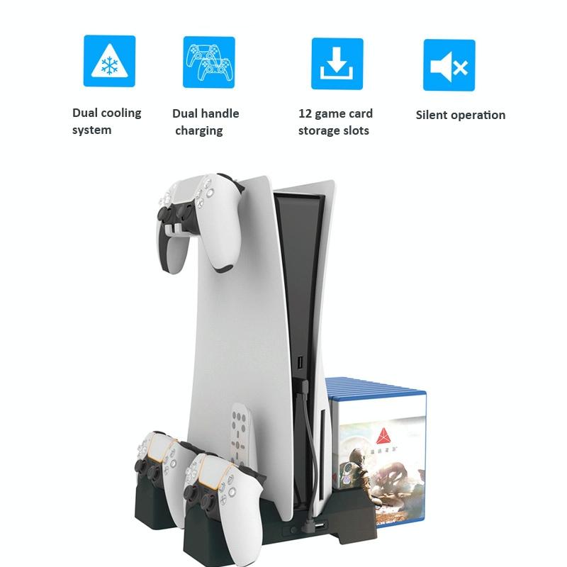 This product is a dual-seat charging and cooling base rack designed for the PlayStation 5. It features a compact design with storage capabilities, making it a practical accessory for gamers. The base provides efficient cooling with dual fans, allows for simultaneous controller charging through contact charging, and offers organized storage with multiple game card slots. Made of durable ABS material, it is lightweight and easy to handle.