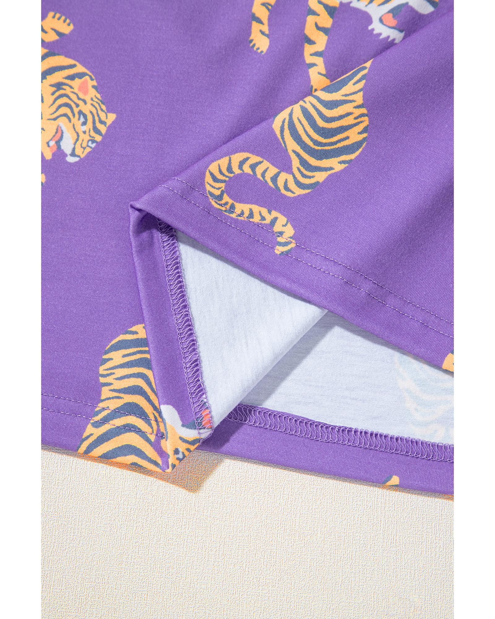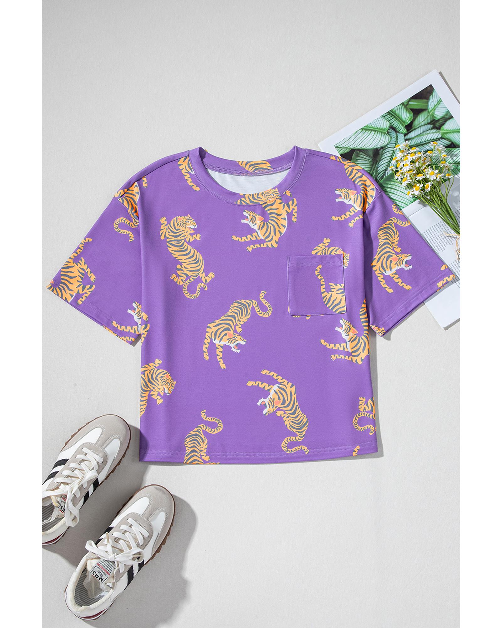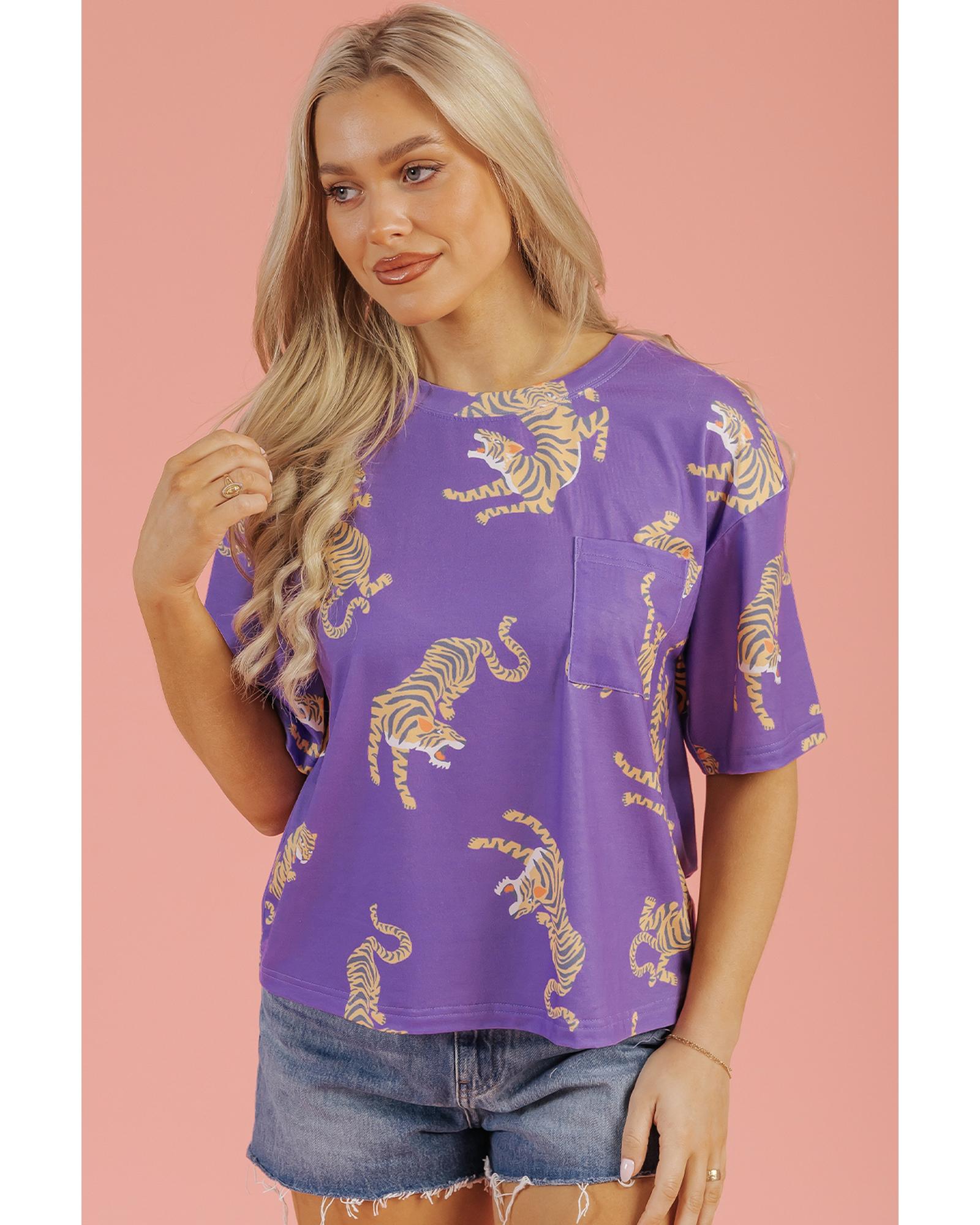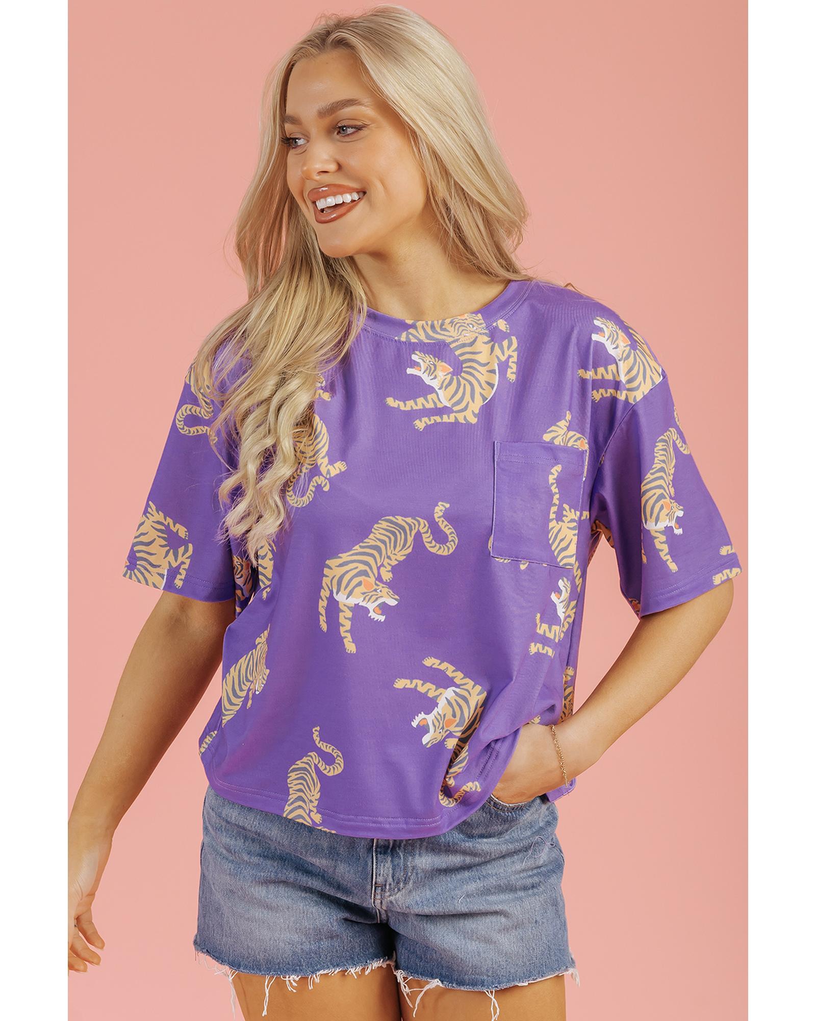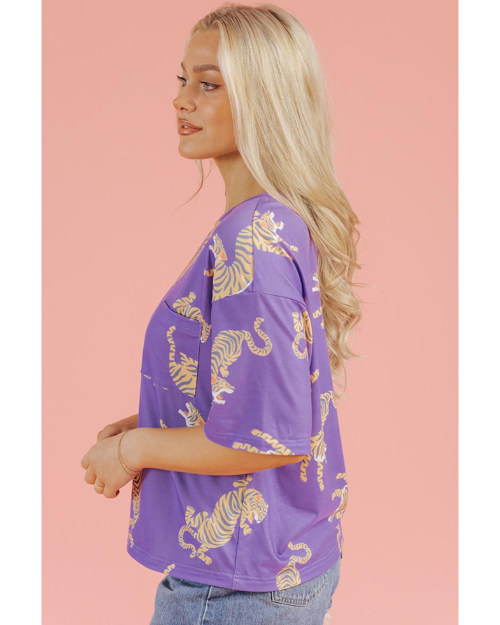 Purple Allover Tiger Printed Patch Pocket Loose T Shirt – XL