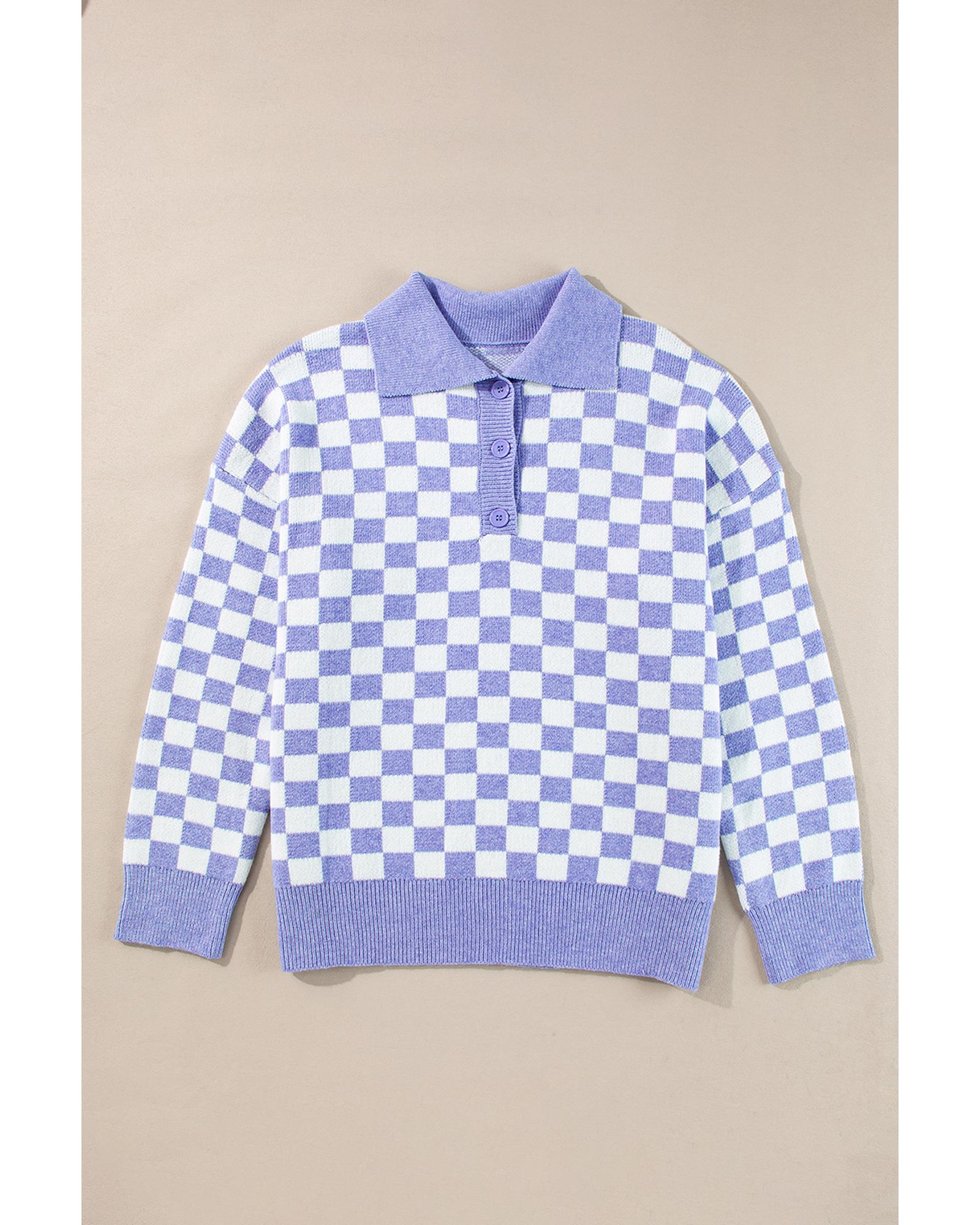 This plus size sweater features a stylish checkered pattern with a collared v-neckline, offering a chic and elegant look. Designed with a trendy fitted silhouette, it provides a comfortable and versatile option suitable for various casual and semi-formal occasions. The sweater is crafted to flatter curvy figures and includes functional buttons for added style and convenience.