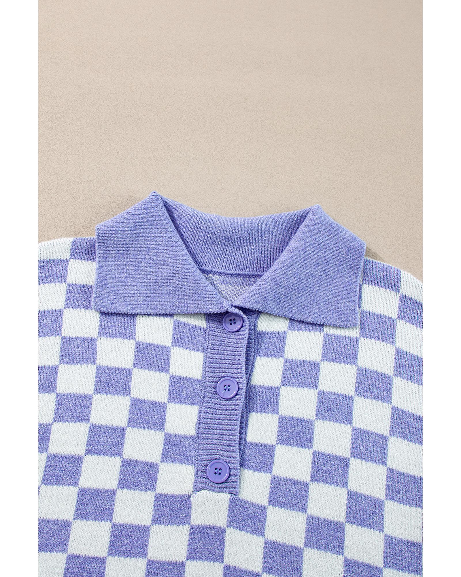 Purple Checkered Collared Buttons Plus Size Sweater – 4X