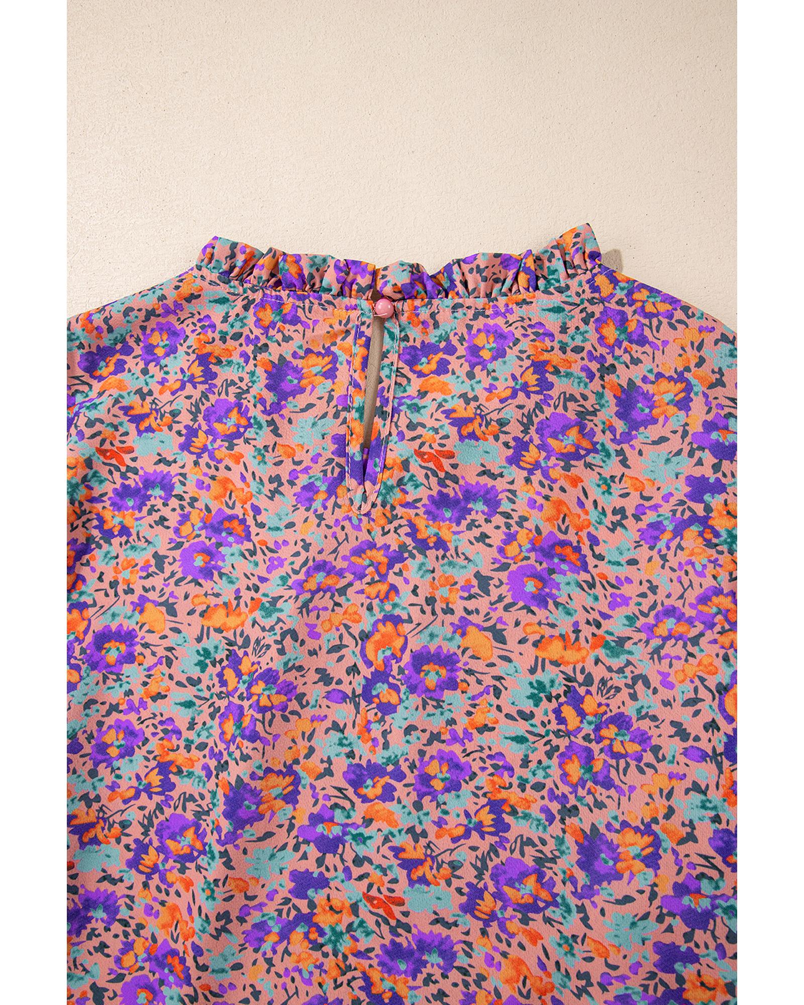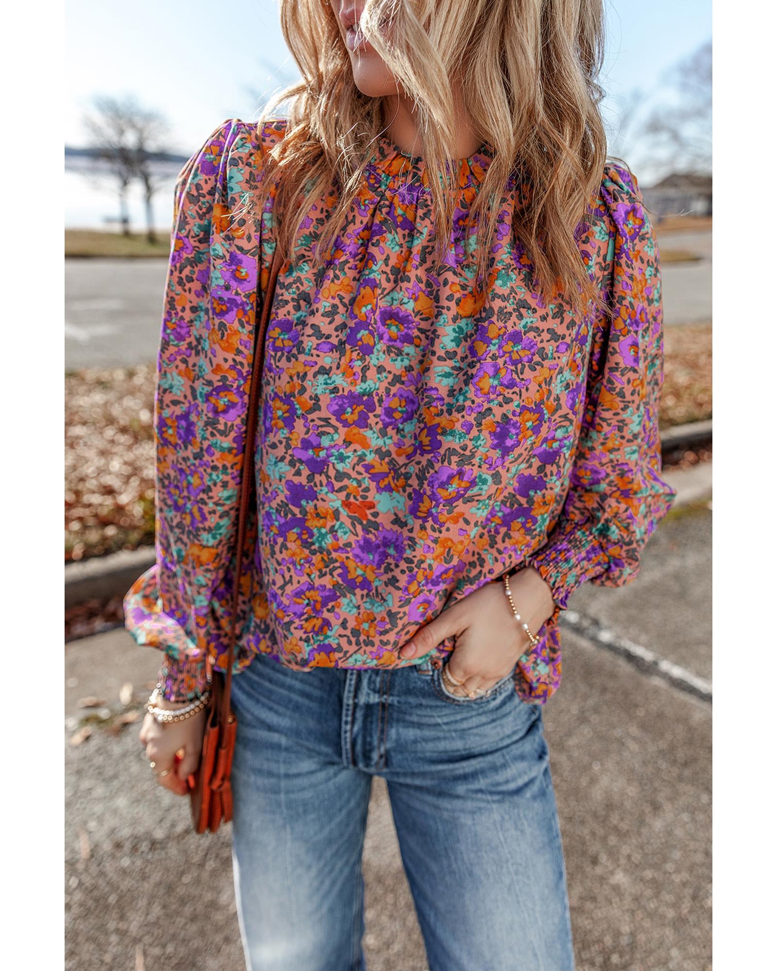 This floral blouse features an allover purple floral print with a feminine frilled O-neck design and shirred cuffs, offering a charming and elegant look. Made from lightweight and breathable fabric, it provides comfort suitable for both casual and special occasions.