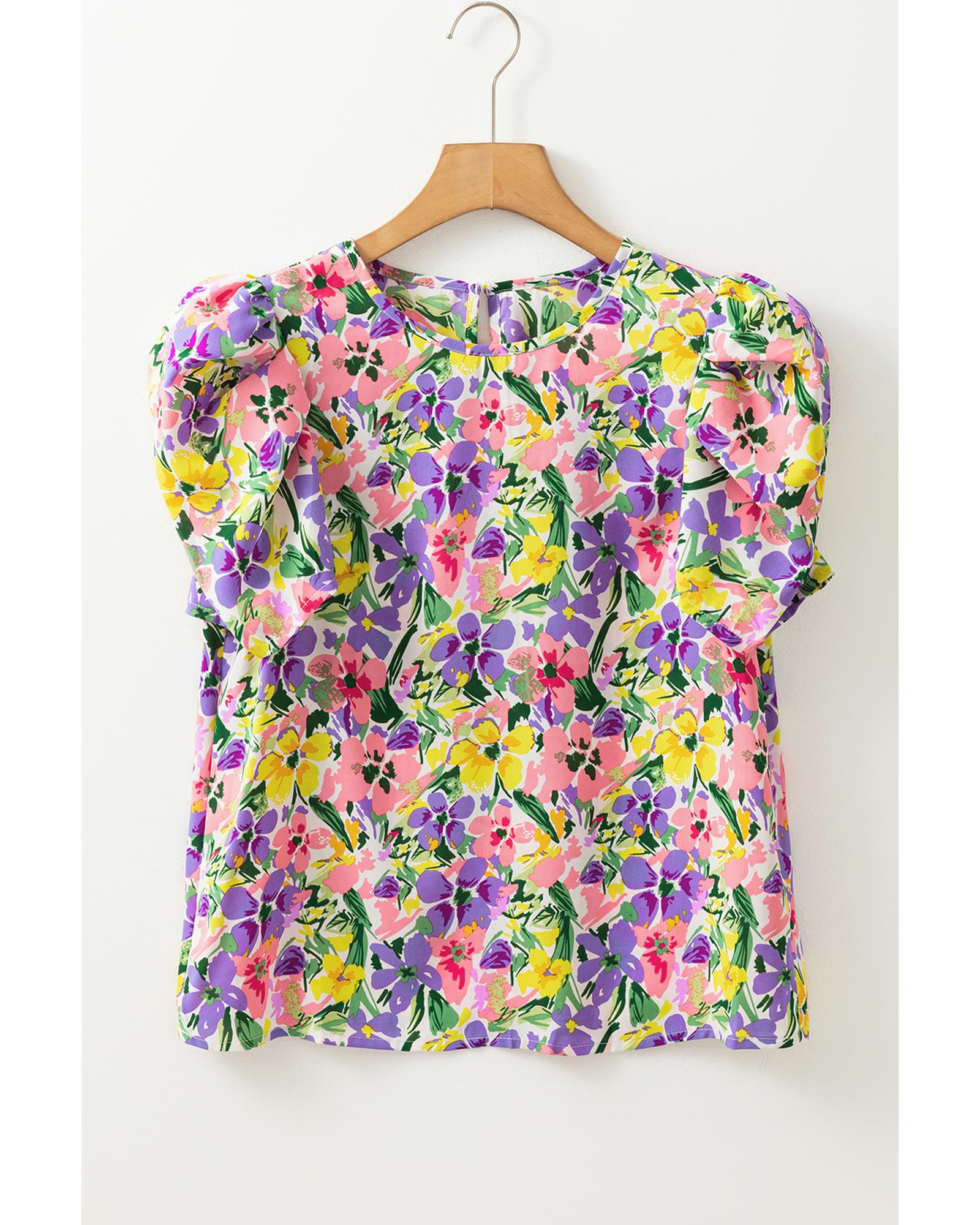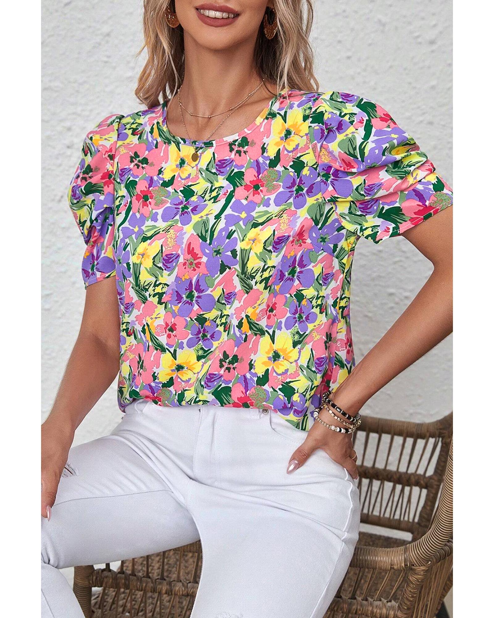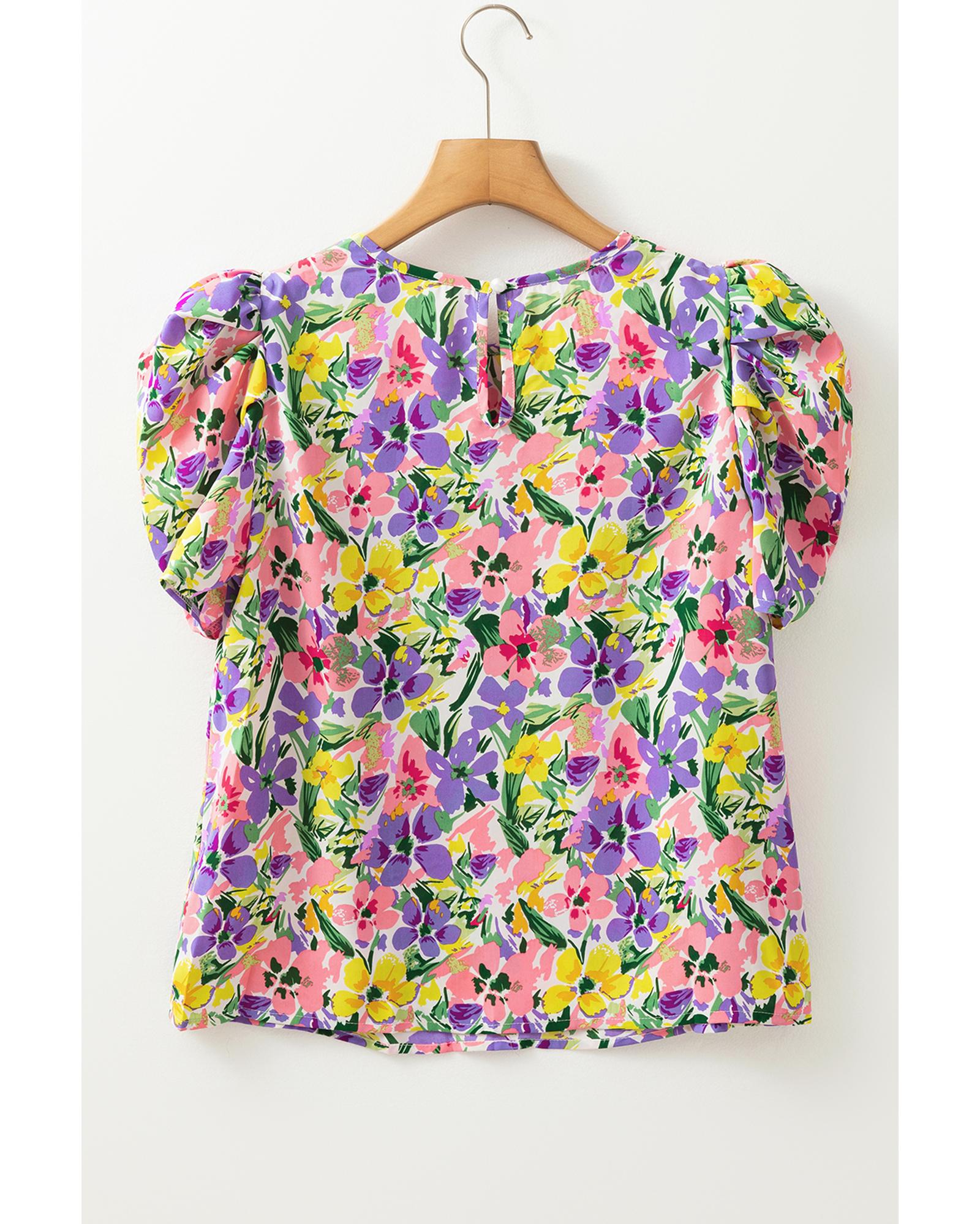This floral print puff short sleeve blouse features a vibrant design and a classic crew neckline, making it a versatile addition to your wardrobe. Its relaxed fit and lightweight fabric ensure comfort and ease of movement, suitable for various occasions from casual outings to dressier events.
