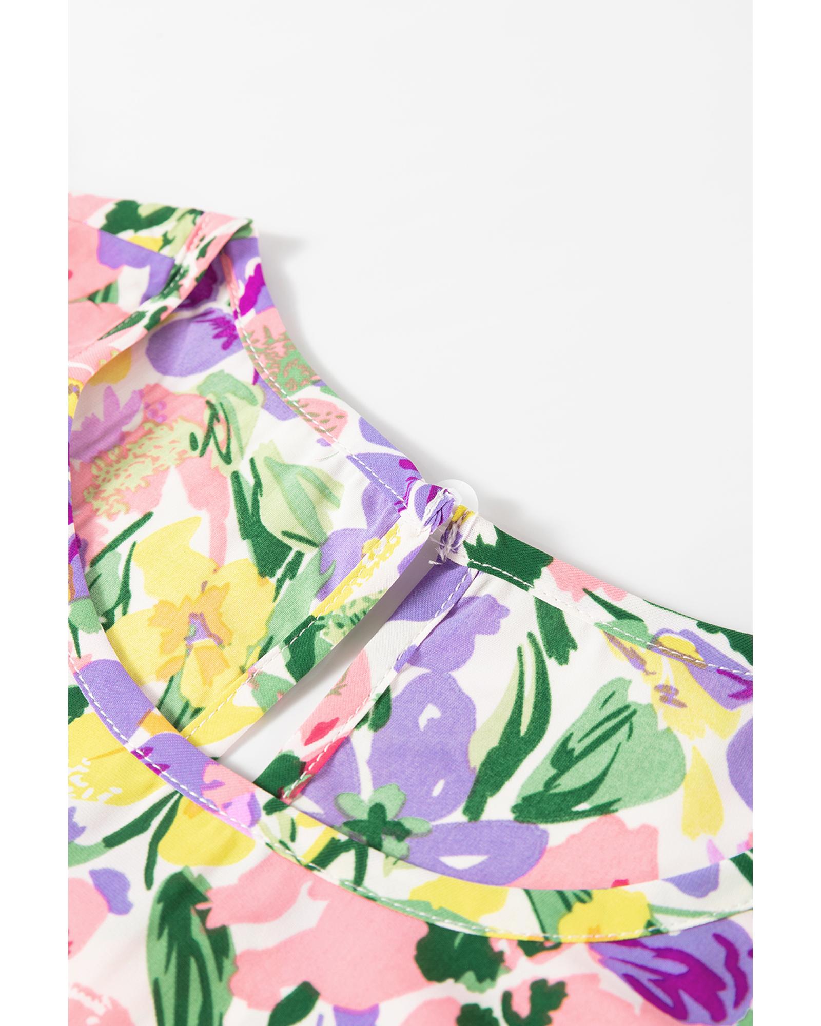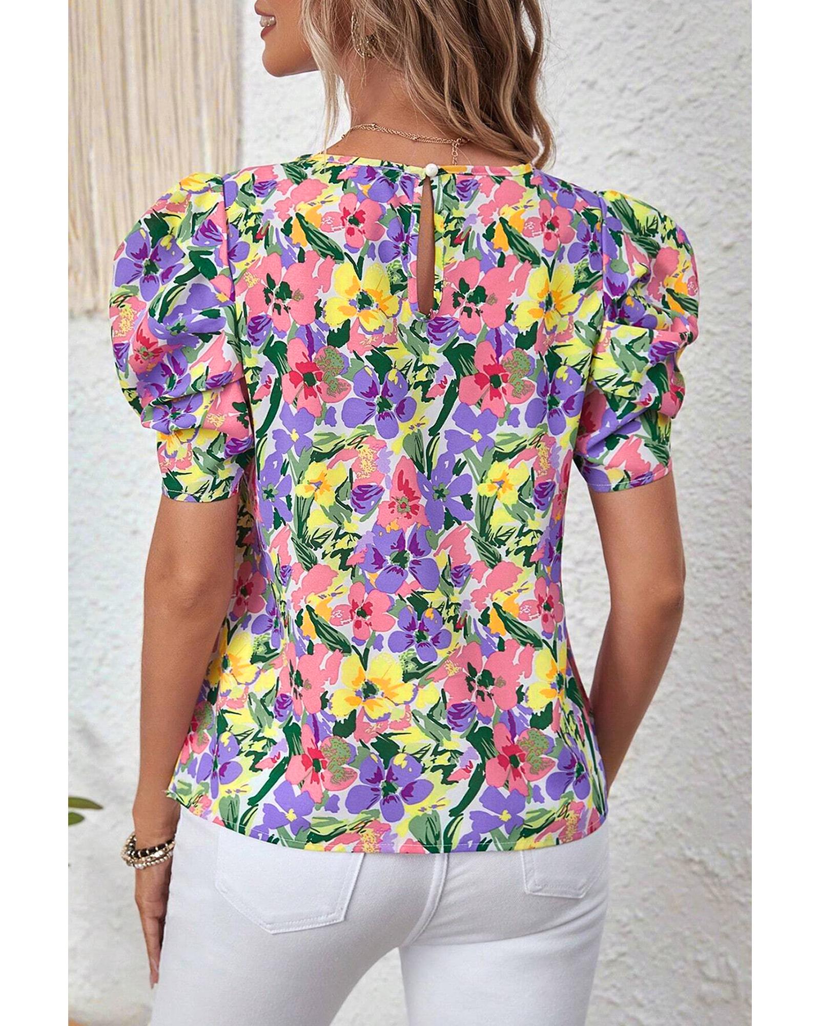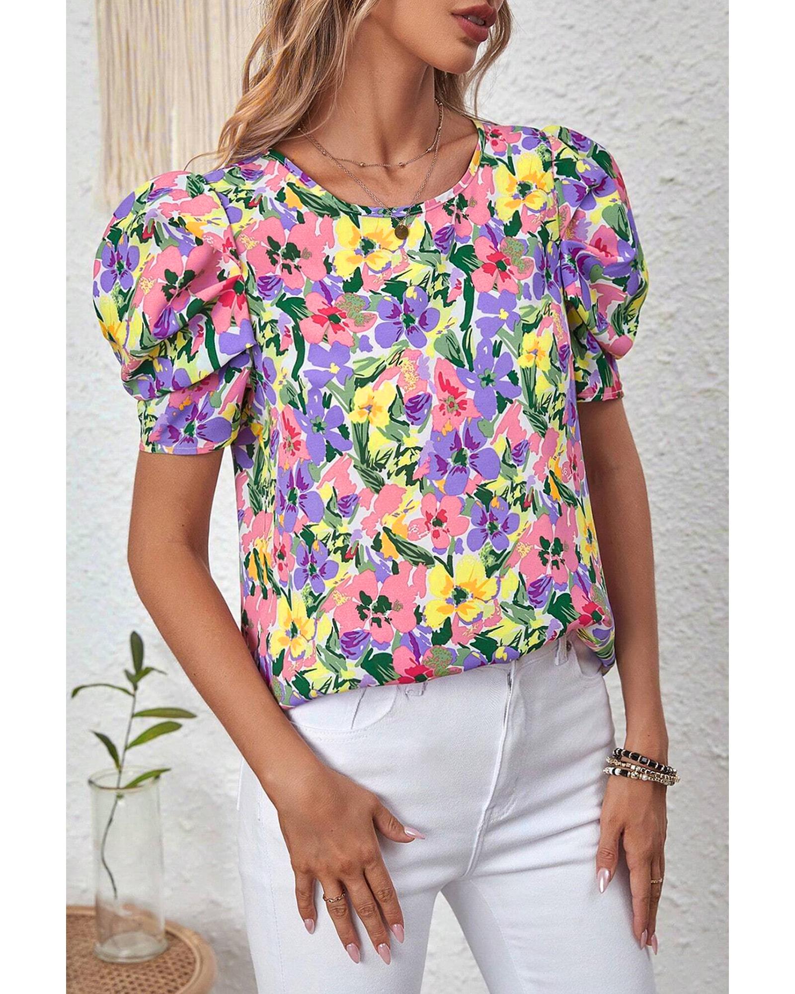 This floral print puff short sleeve blouse features a vibrant design and a classic crew neckline, making it a versatile addition to your wardrobe. Crafted from lightweight fabric, it offers comfort and breathability, suitable for various occasions from casual outings to dressier events.