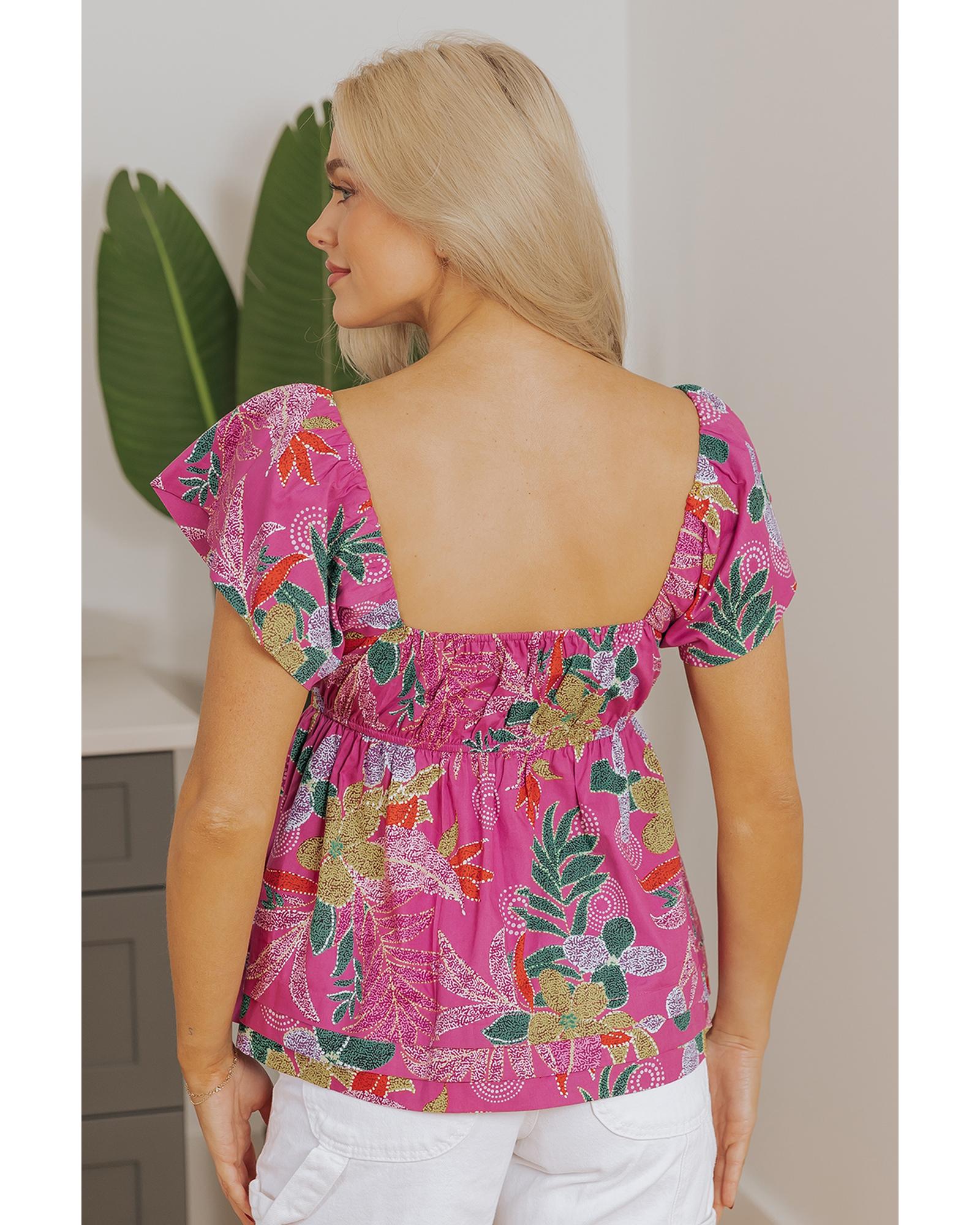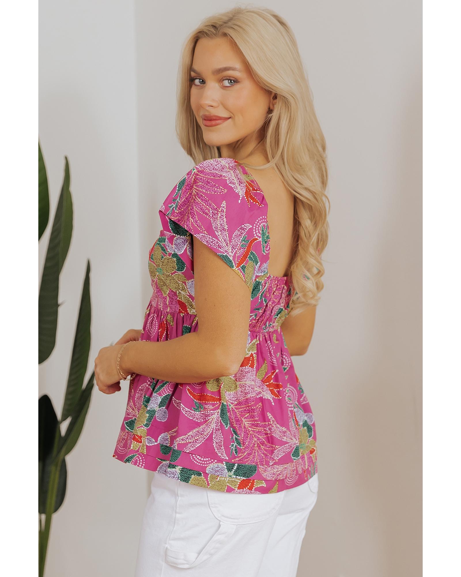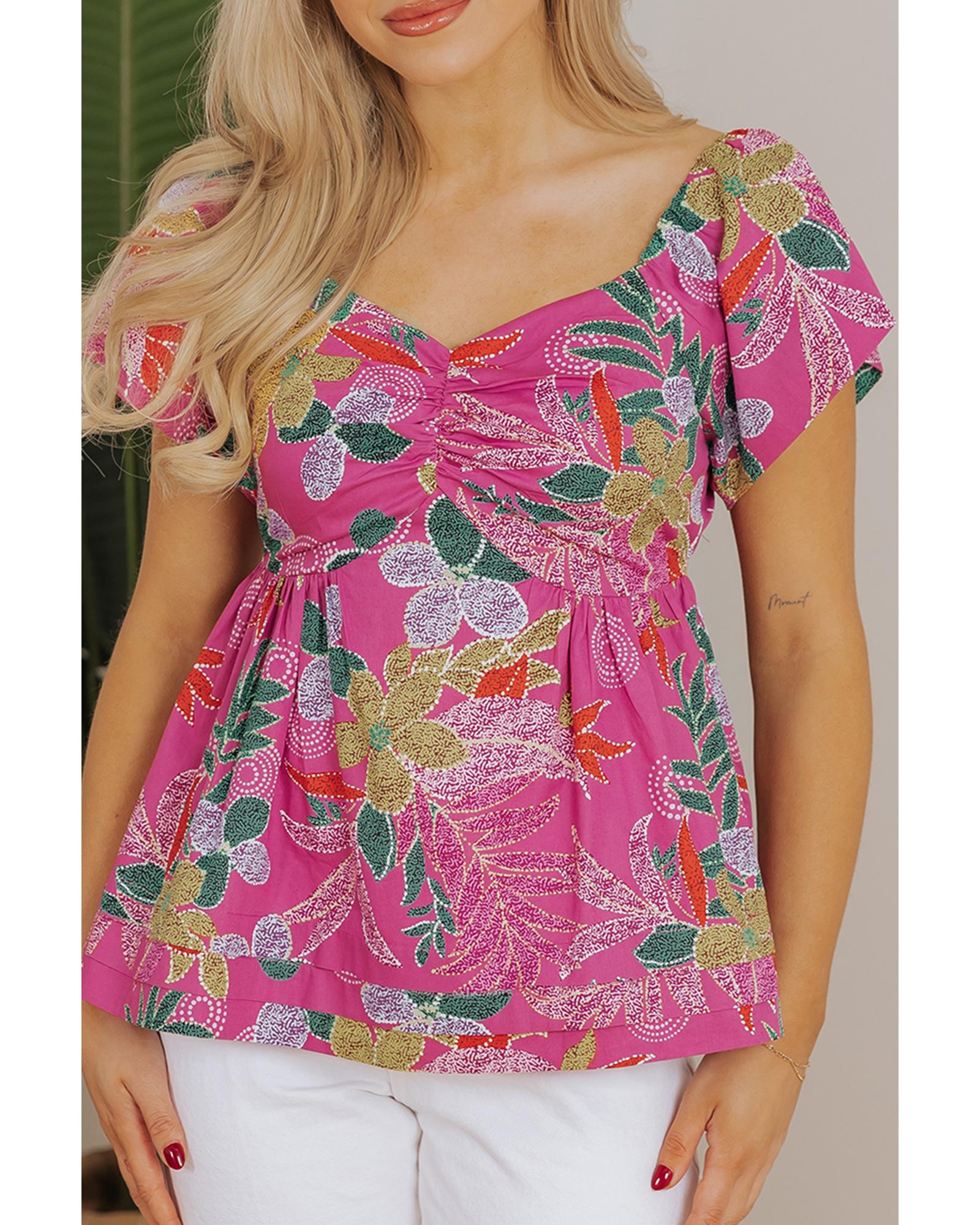 This purple floral print blouse features a sweetheart neckline and flutter short sleeves, offering a feminine and stylish look. The slightly flared hem adds a touch of elegance, making it suitable for various casual occasions. Crafted from high-quality fabric, it provides comfort and durability. Perfect for pairing with denim shorts and simple accessories for a chic outfit.