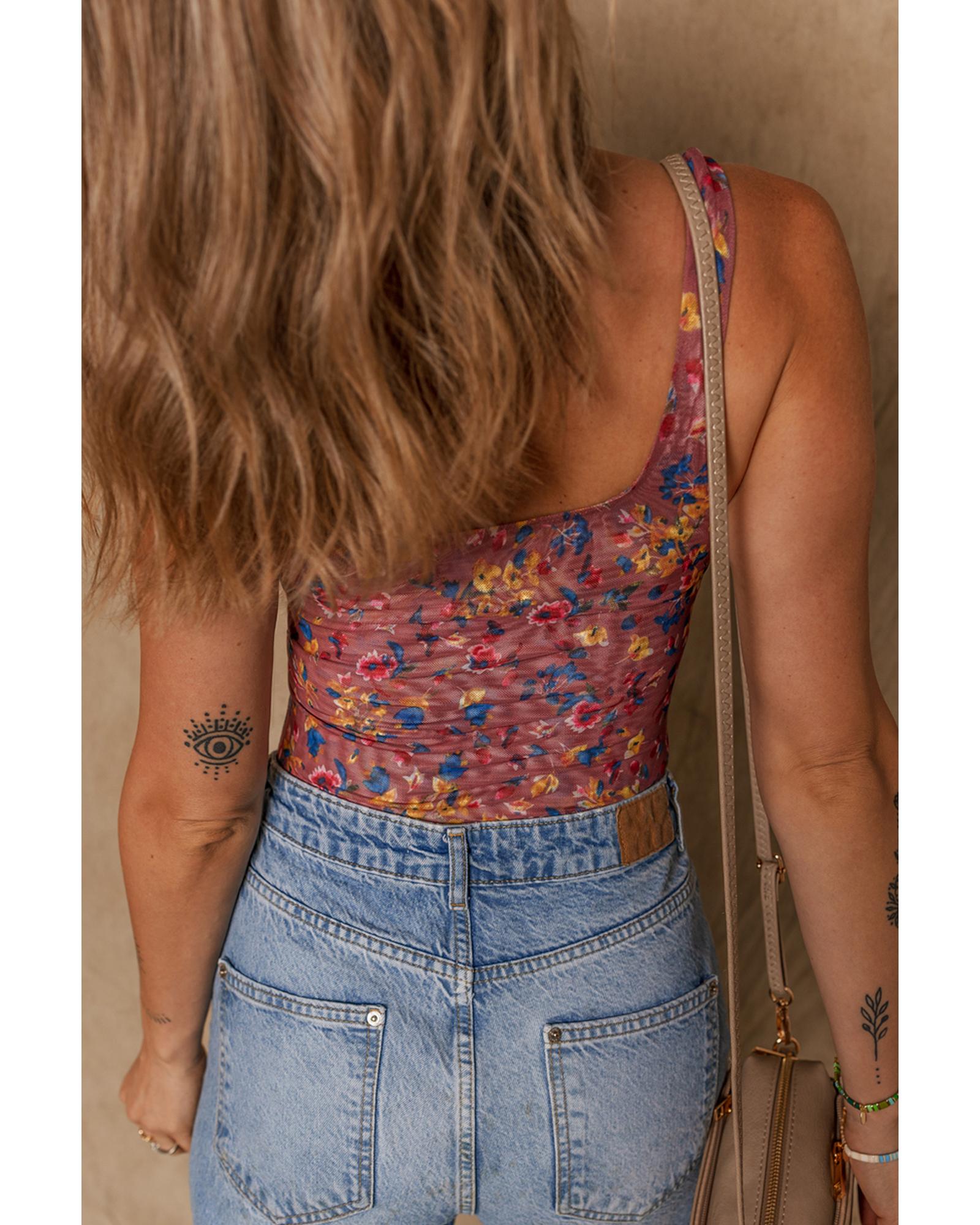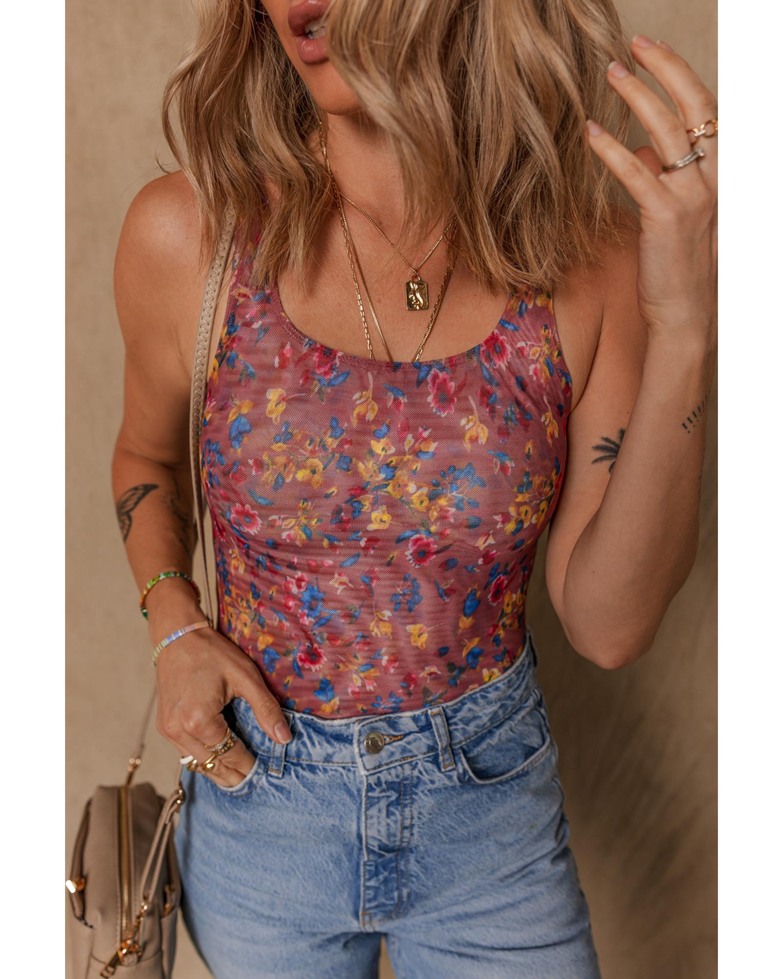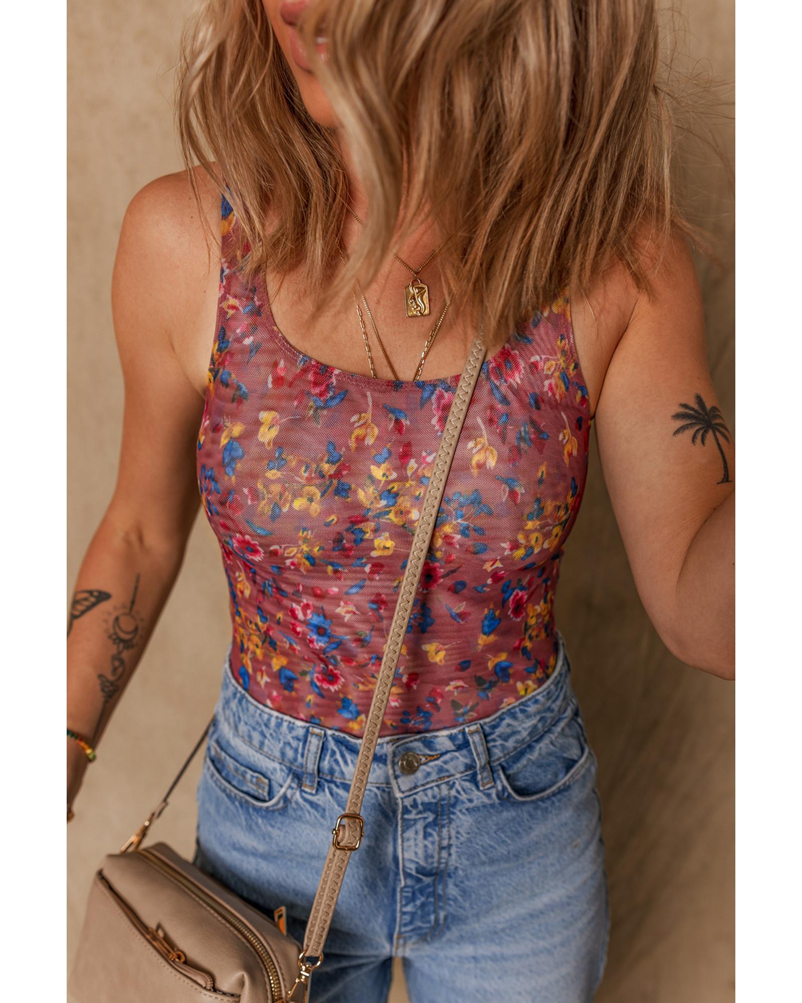 This sleeveless bodysuit features a vibrant purple floral print and is made from a stretchy sheer mesh fabric, offering both style and comfort. The U neckline and wide straps add to its elegant design, making it a versatile piece suitable for various outfits.