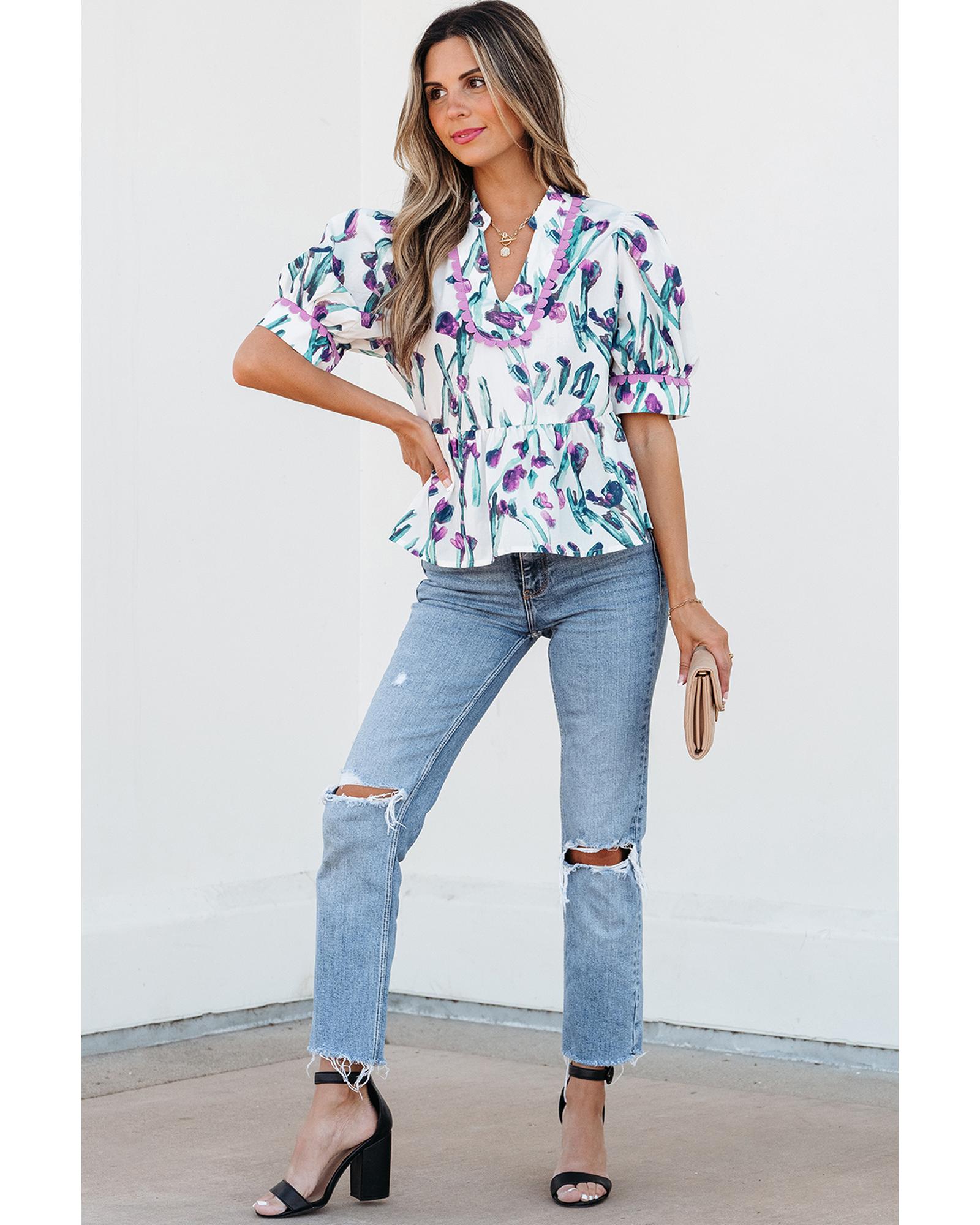 This floral peplum top features a delicate ricrac trim and a feminine V-neck design. It is characterized by puff sleeves and a flattering peplum waist, creating a charming and stylish silhouette. The floral pattern adds a touch of elegance, making it suitable for various occasions.