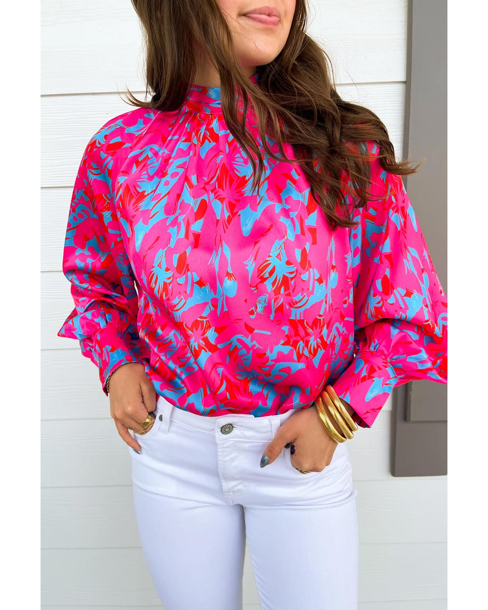 • 1 x Purple Printed Bubble Sleeve Mock Neck Blouse