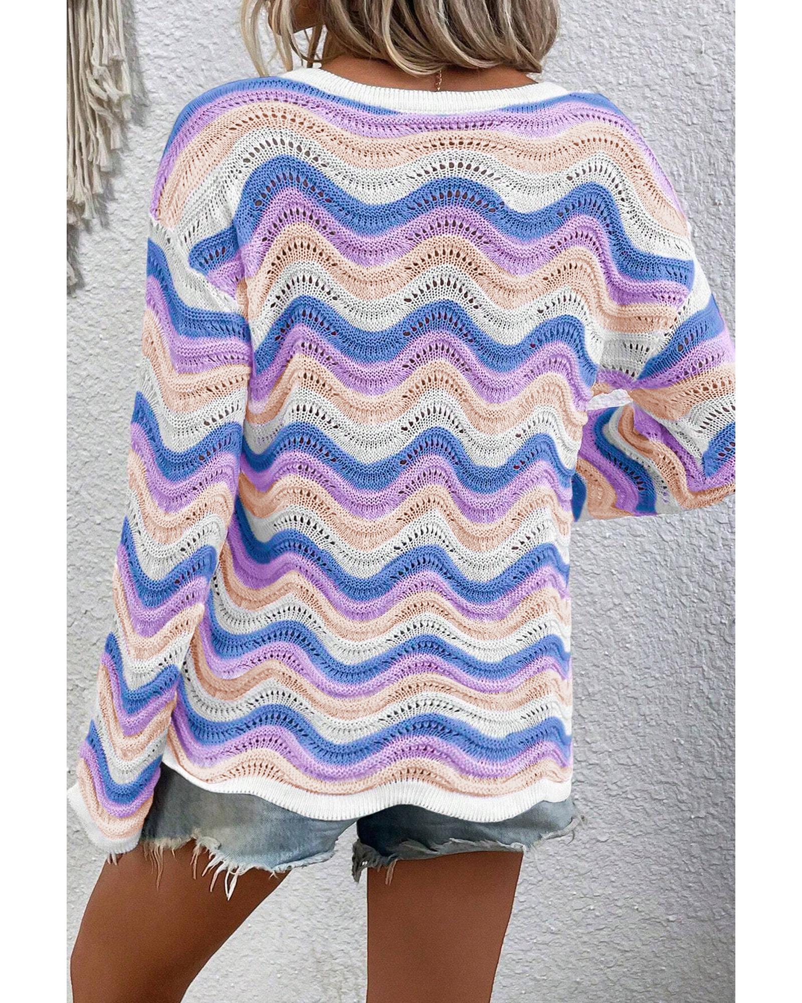 This sweater features a trendy fitted design with a modern take on classic knitwear. It showcases a distinctive wavy stripe pattern combined with delicate pointelle details, creating a stylish and textured look. Perfect for pairing with jeans or leggings, this piece offers both comfort and fashion.