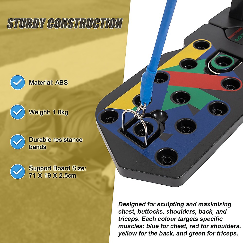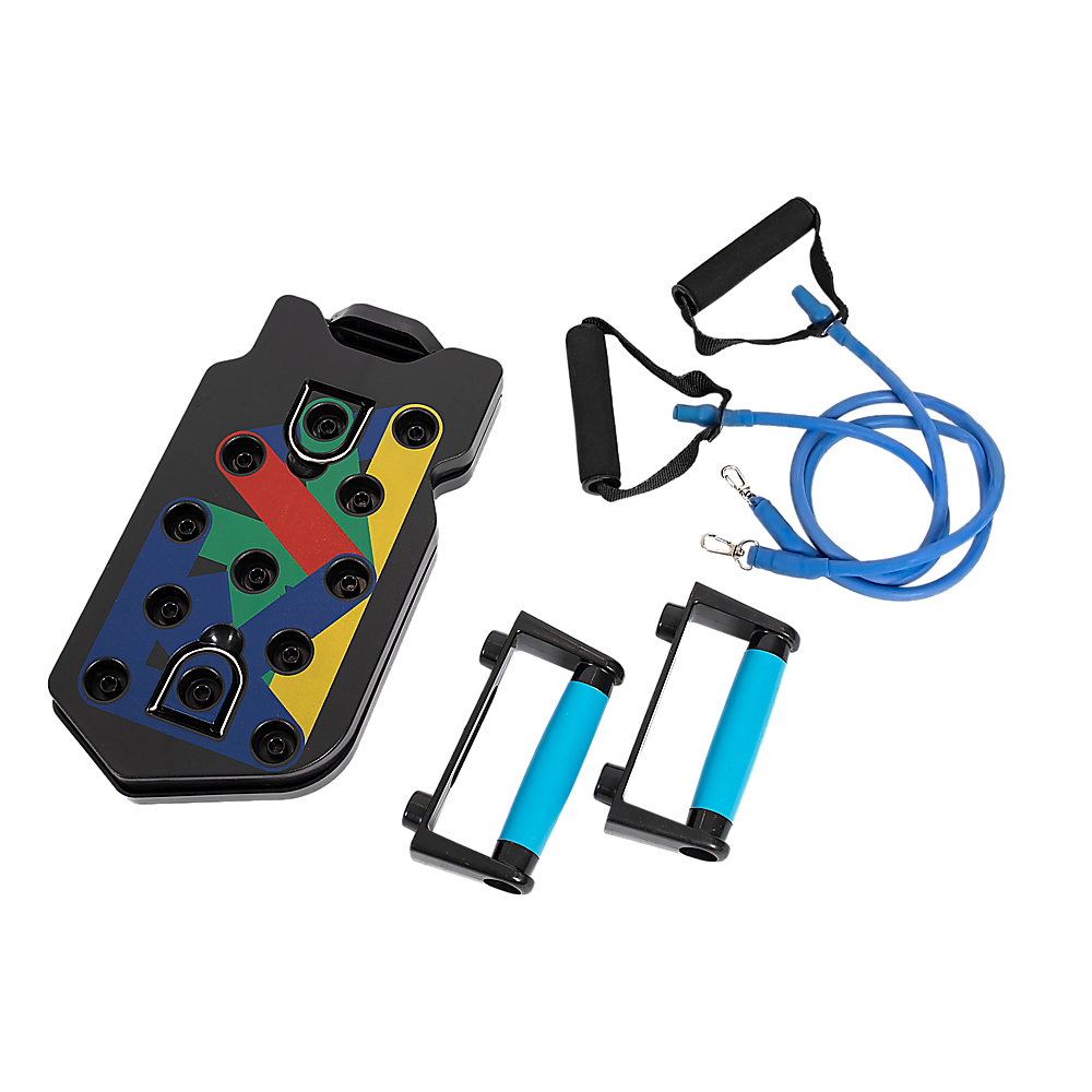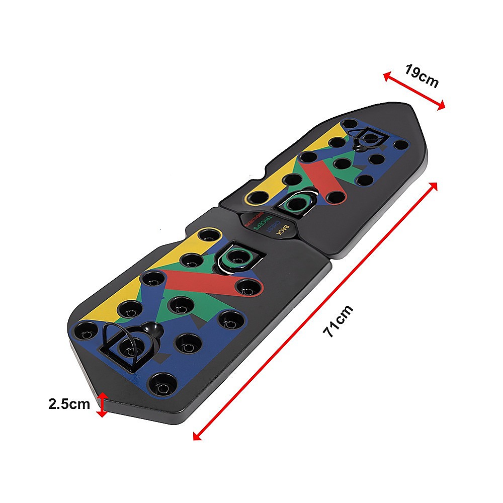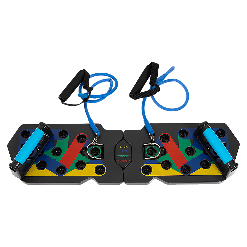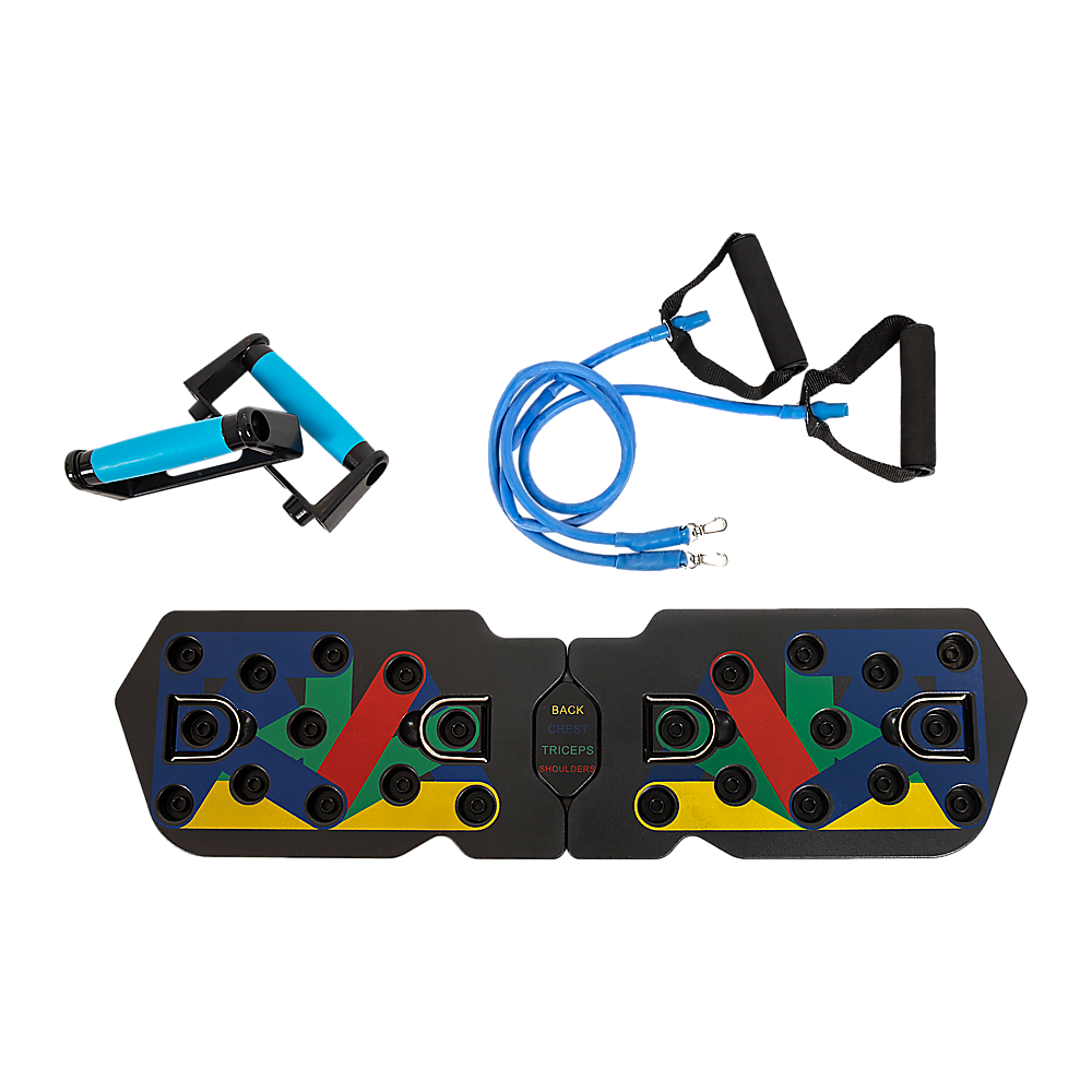 This 13-in-1 push-up board rack system offers a versatile and effective workout solution for full-body strength training. It features multiple functions and resistance bands to target various muscle groups, making it suitable for users of all ages and fitness levels. The compact and foldable design ensures easy storage and portability, while the non-slip silica handles provide a secure grip during exercise.