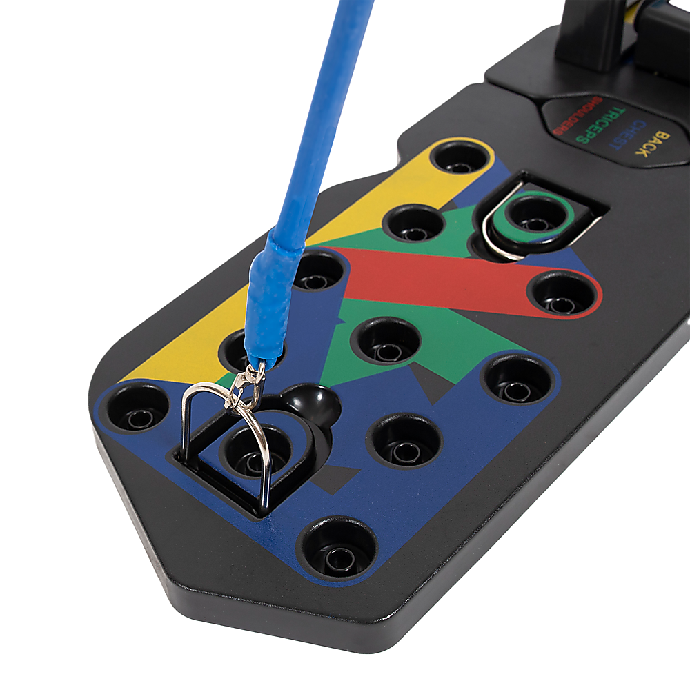 • Color-coded to target specific muscle groups: chest, shoulders, back, and triceps