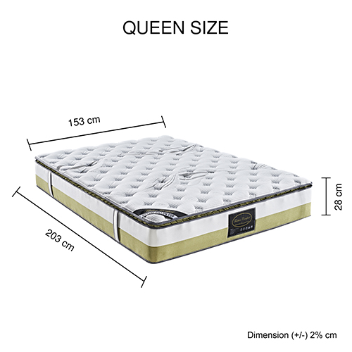 Package contents include one queen size mattress with a pillow top pocket spring and foam construction, designed for medium firmness support.