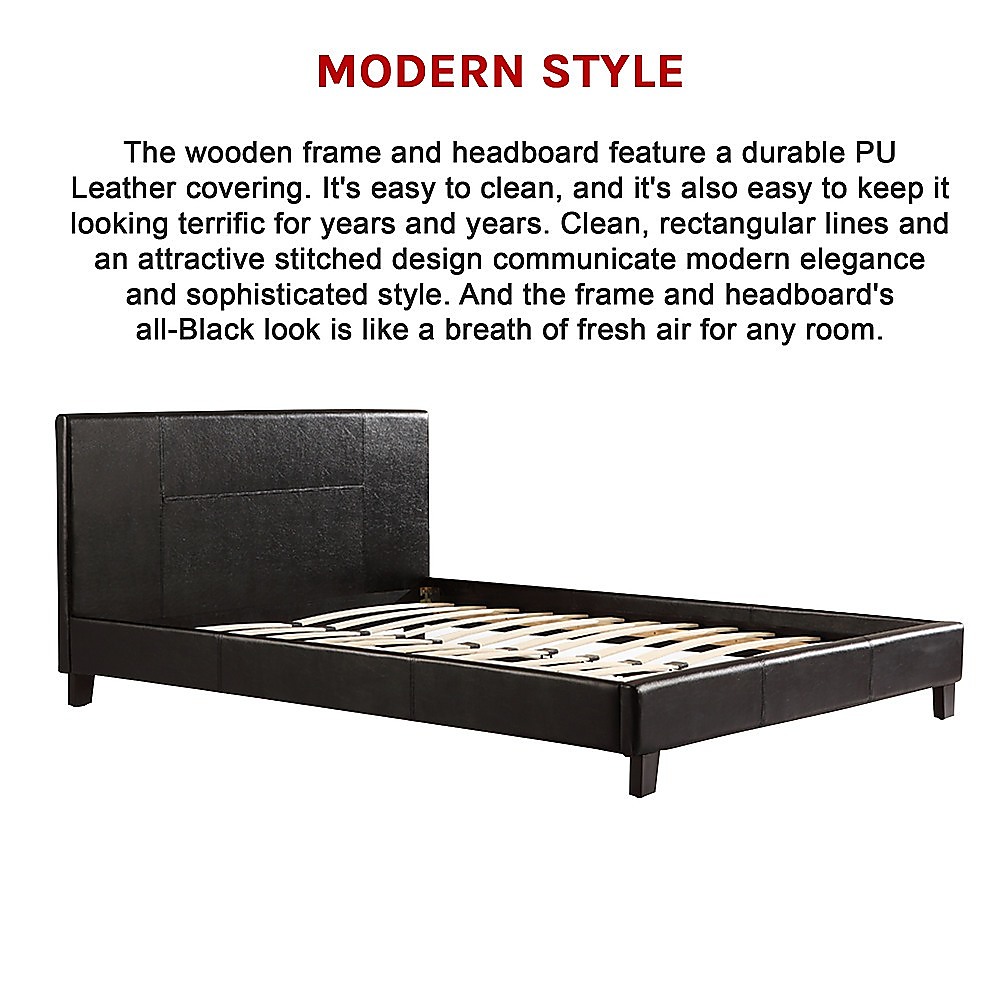 This queen-sized bed frame features a modern design with a durable PU leather covering, offering both style and comfort. Its sturdy all-wood construction ensures long-lasting durability, making it an ideal addition to any bedroom. The sleek black finish and stitched detailing add a touch of sophistication to the overall look.