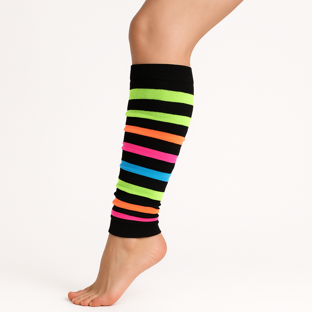 Enhance your outfit with these colorful rainbow leg warmers, perfect for adding a fun and vibrant element to your look for any occasion.