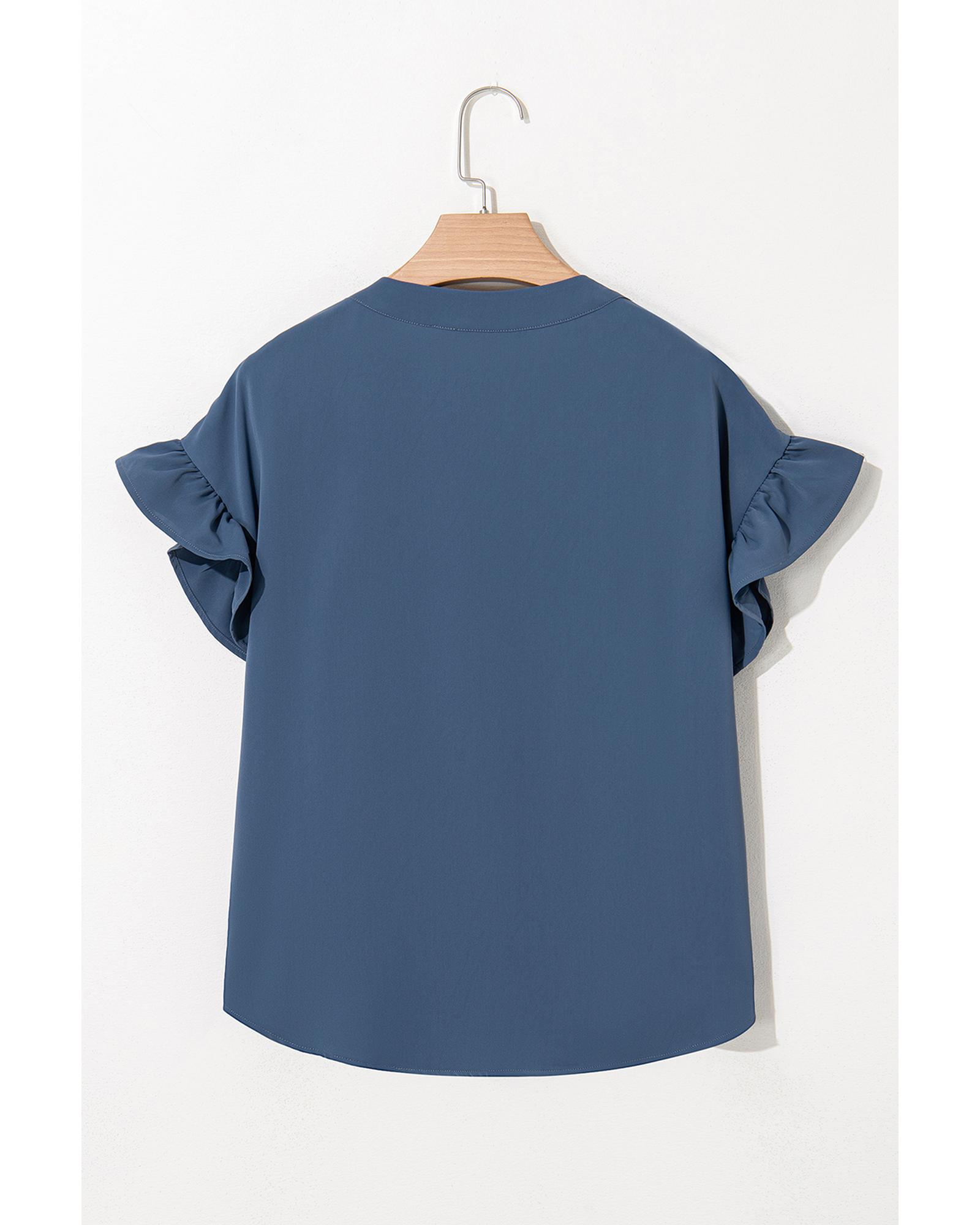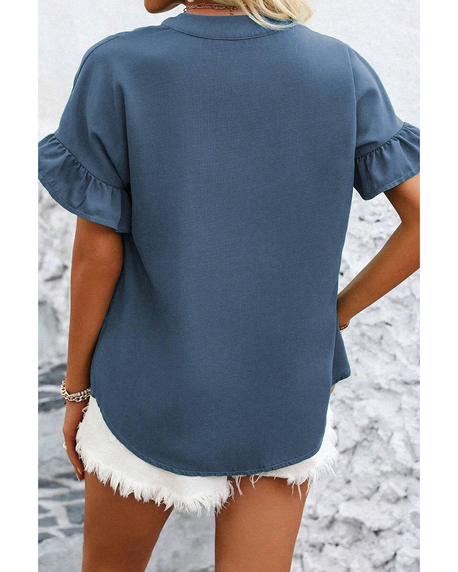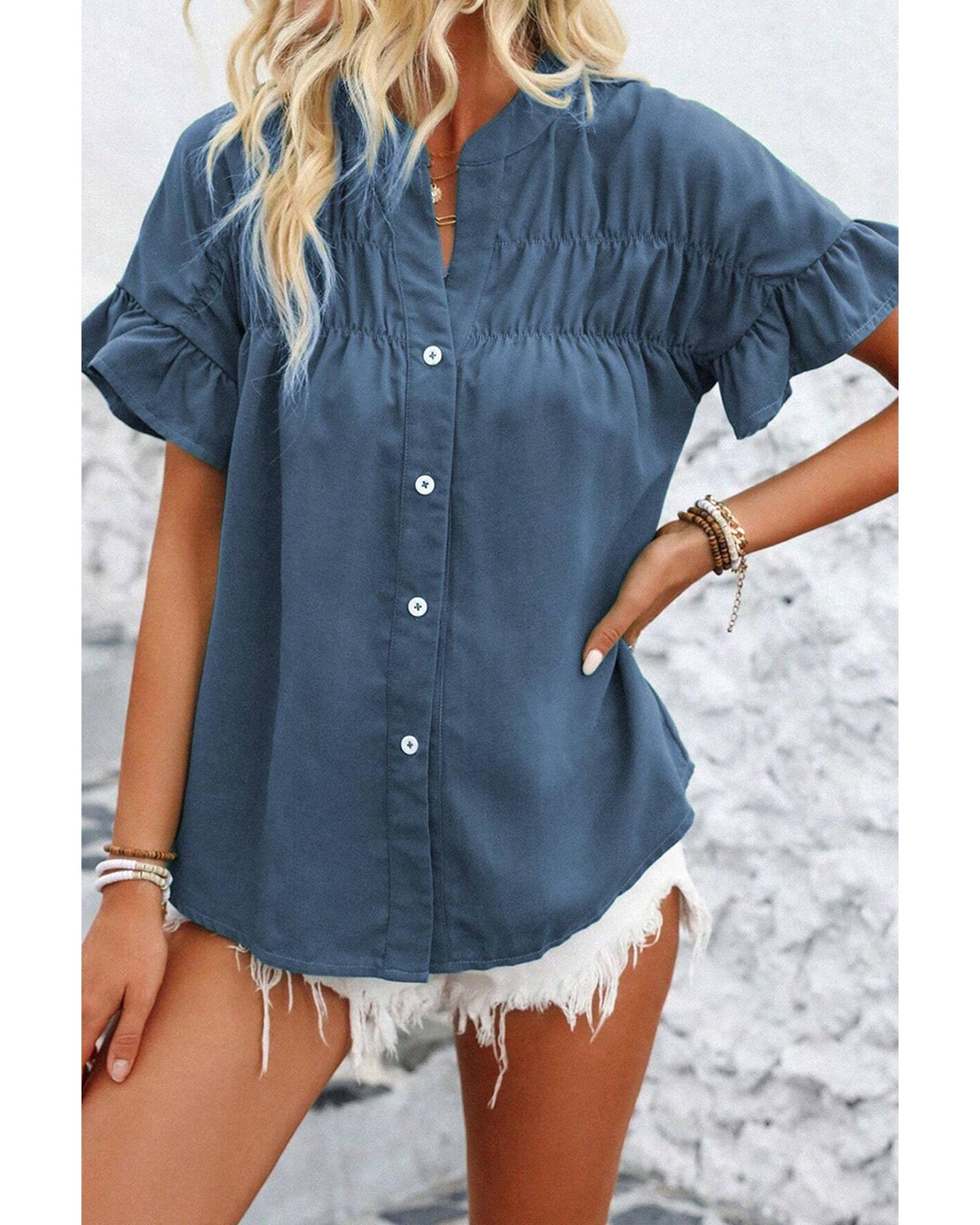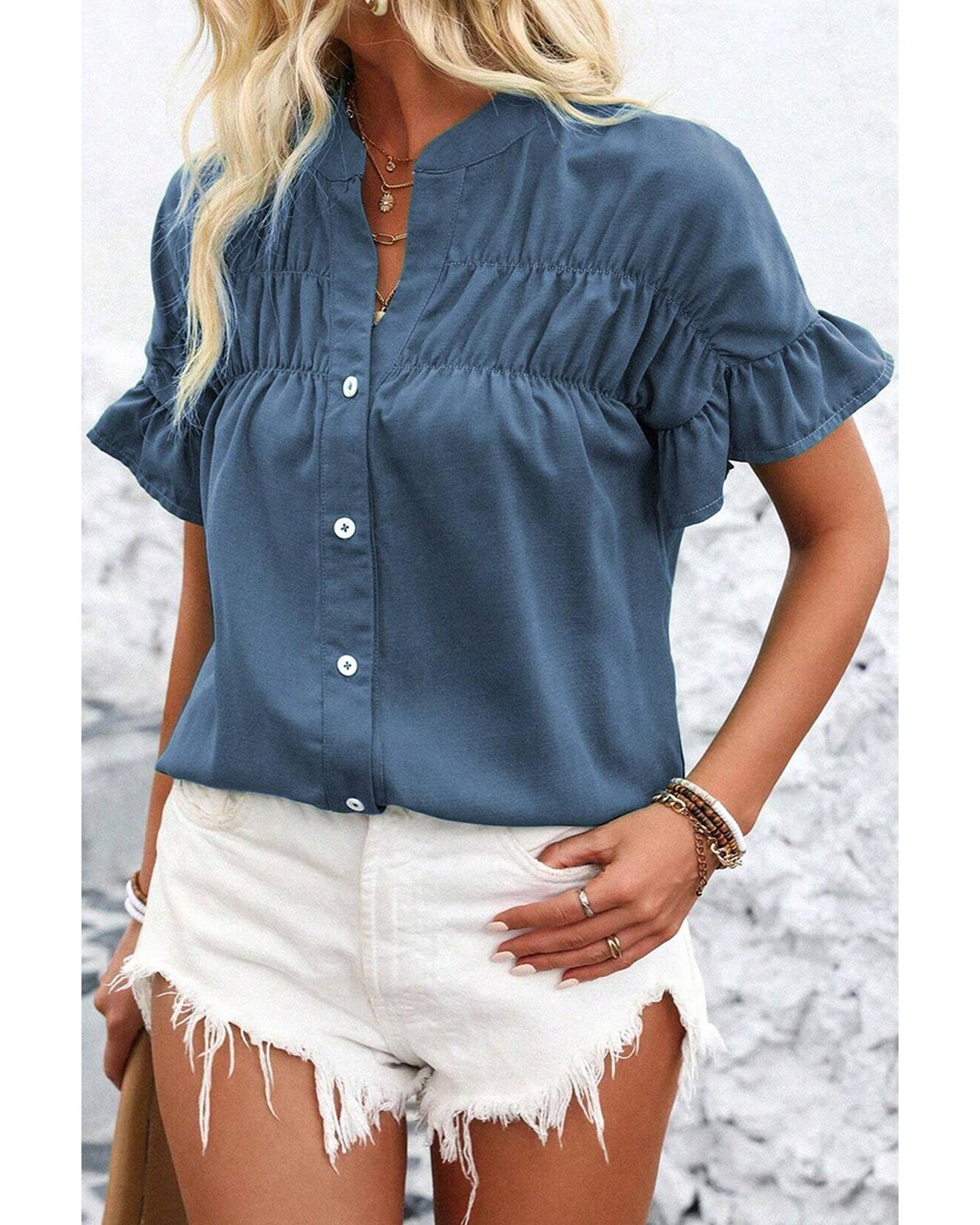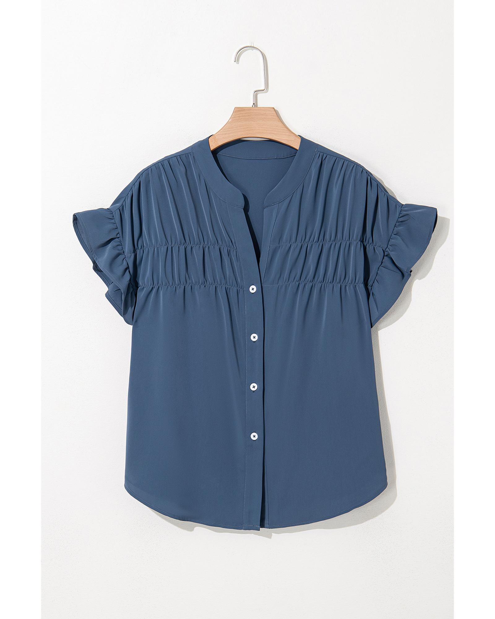 This solid color shirt features a stylish ruffle design on the short sleeves and ruched details, offering a fashionable and comfortable look. The button-front closure with a split neckline adds a touch of elegance, making it suitable for various occasions. Available in multiple colors and sizes, it provides versatile options to suit different preferences.