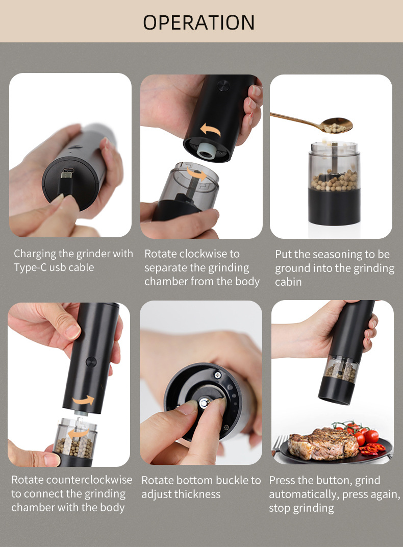 This rechargeable electric salt and pepper grinder set offers a sleek and modern design, combining functionality and style. It features adjustable ceramic grinding cores for precise seasoning and a rechargeable USB port for eco-friendly charging. Suitable for various spices, these grinders are ideal for home use, dining tables, or as a gift.