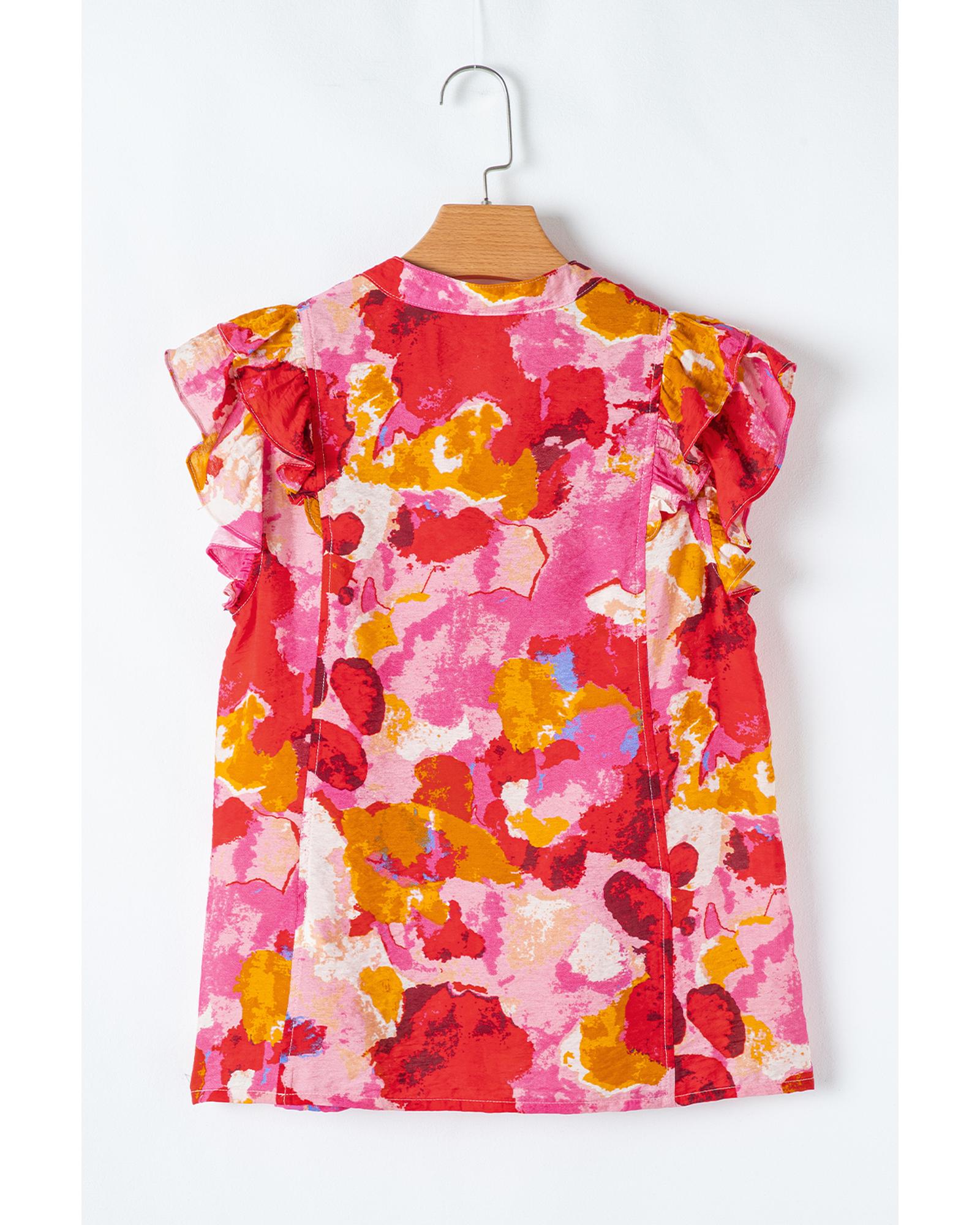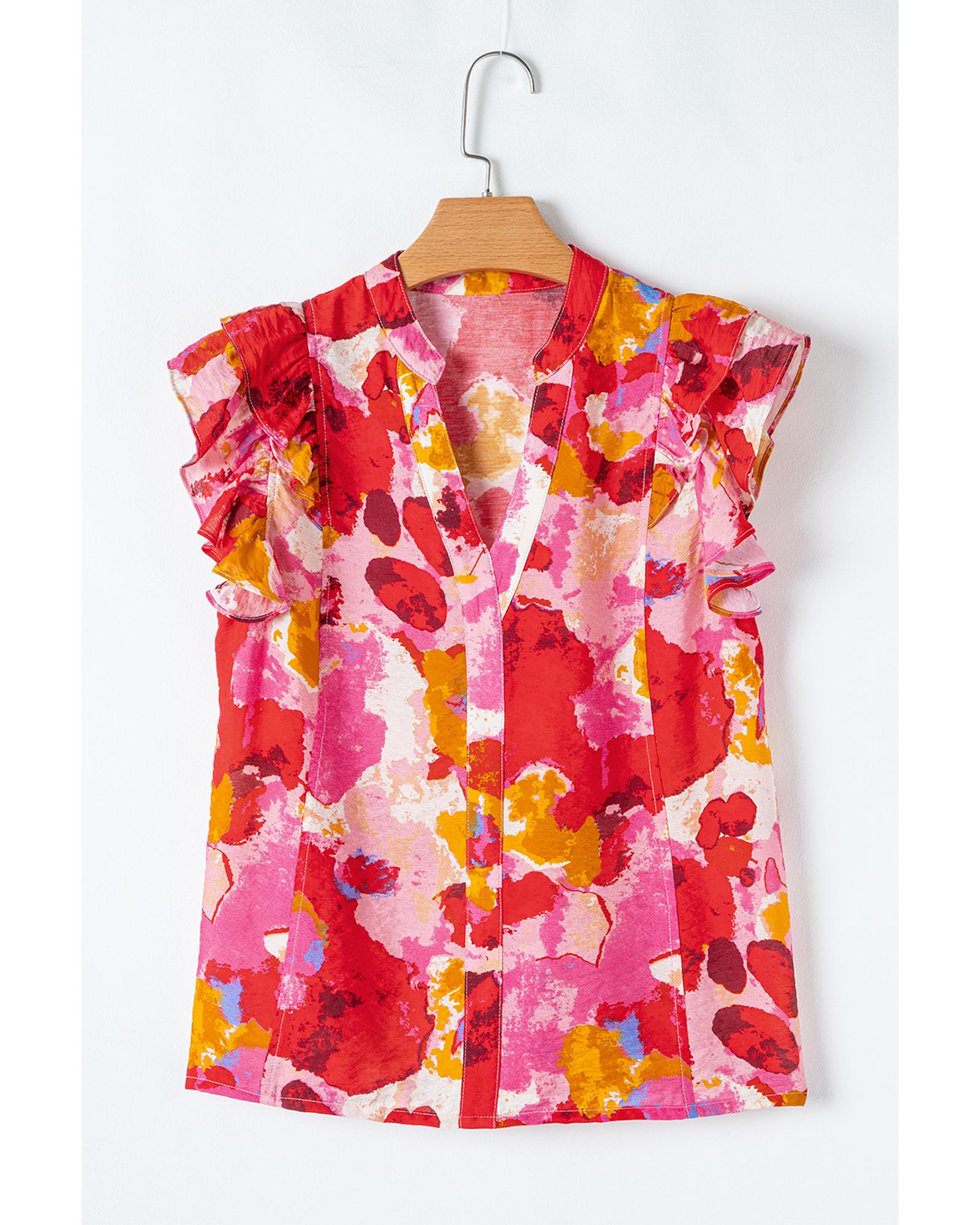 This blouse features a vibrant abstract print and a stylish split V-neck design, making it a versatile addition to your wardrobe. The ruffle short sleeves add a feminine touch, perfect for creating a sophisticated look. It pairs well with skirts or trousers for various occasions.