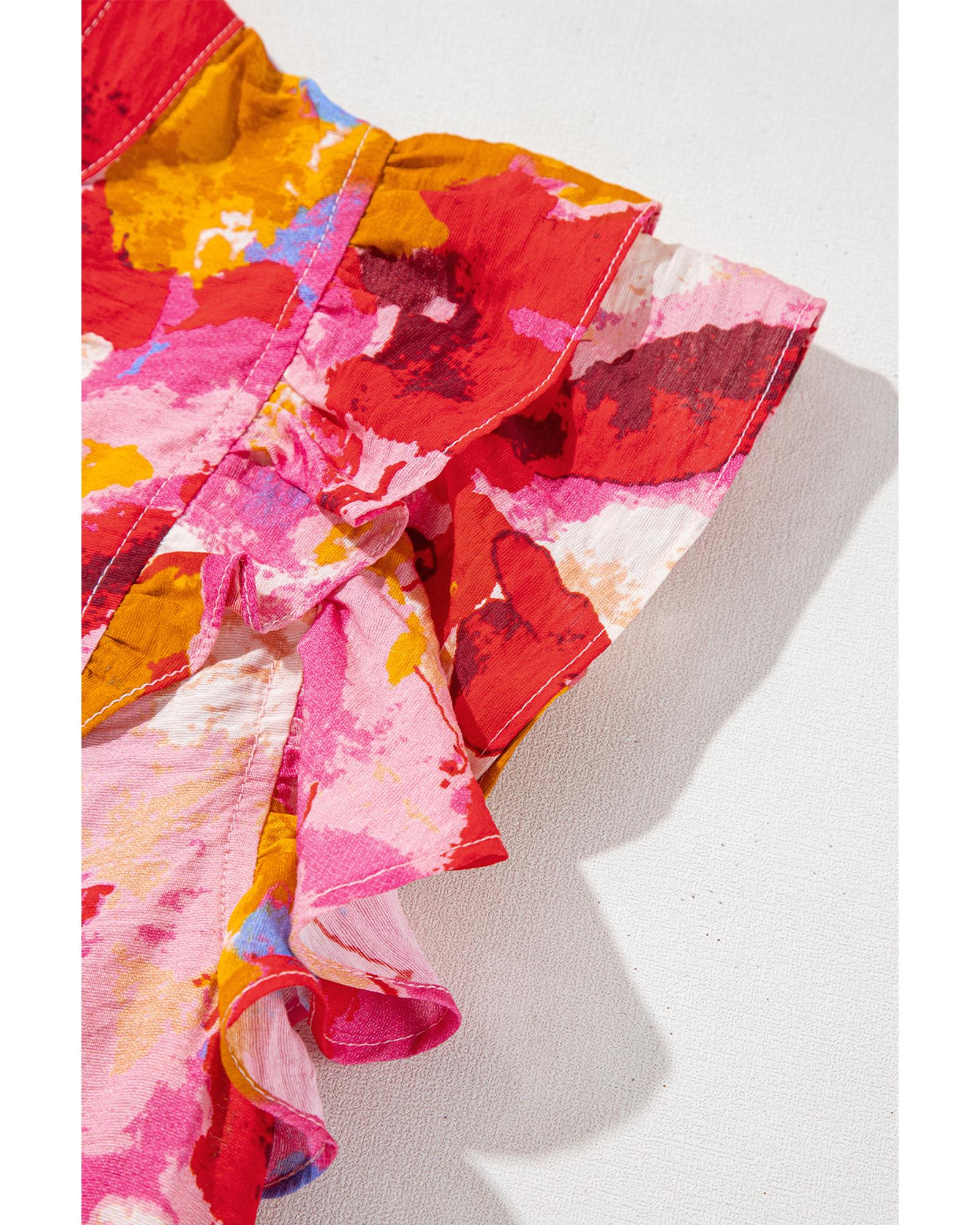 Red Abstract Print Split V Neck Ruffle Short Sleeve Blouse – M