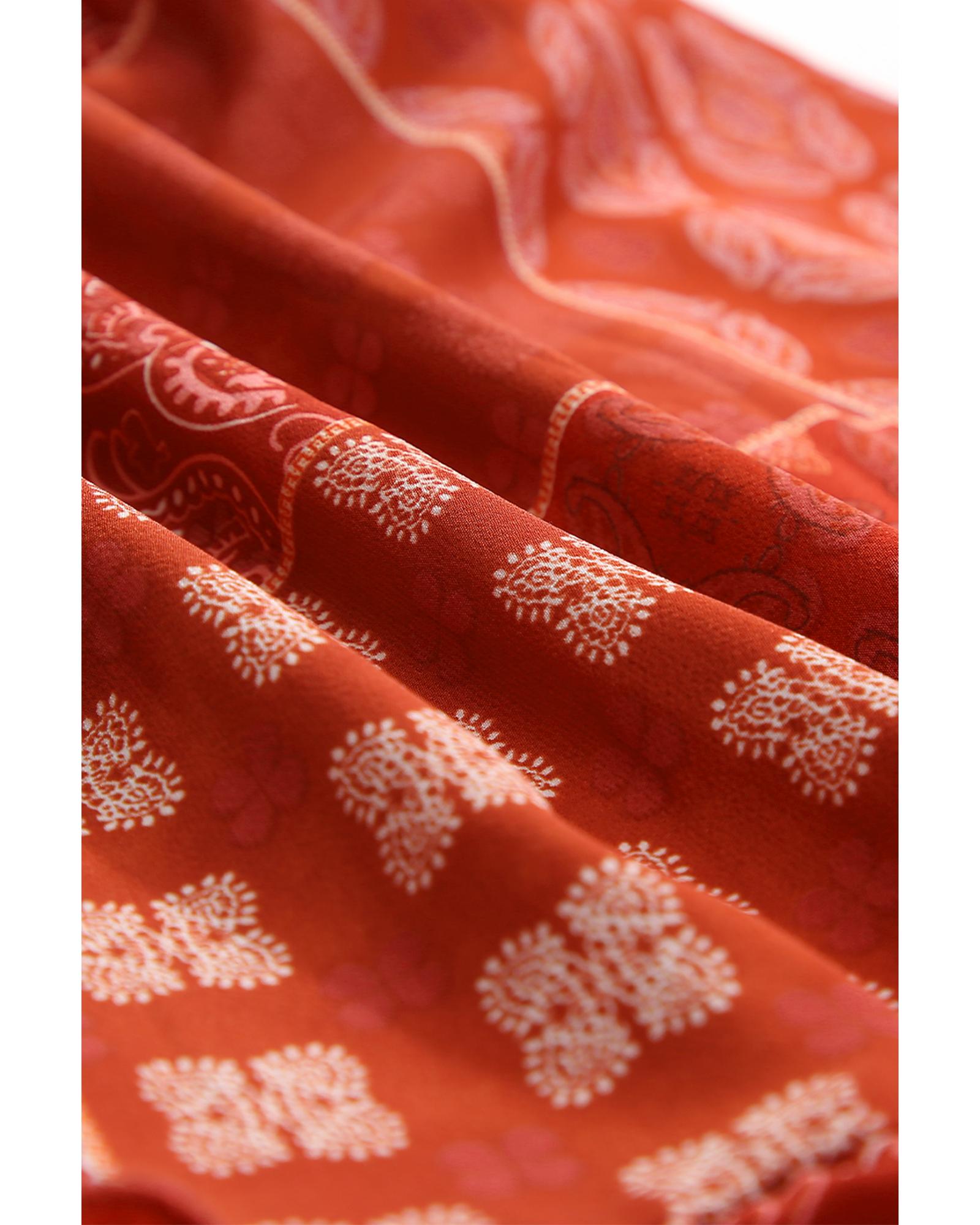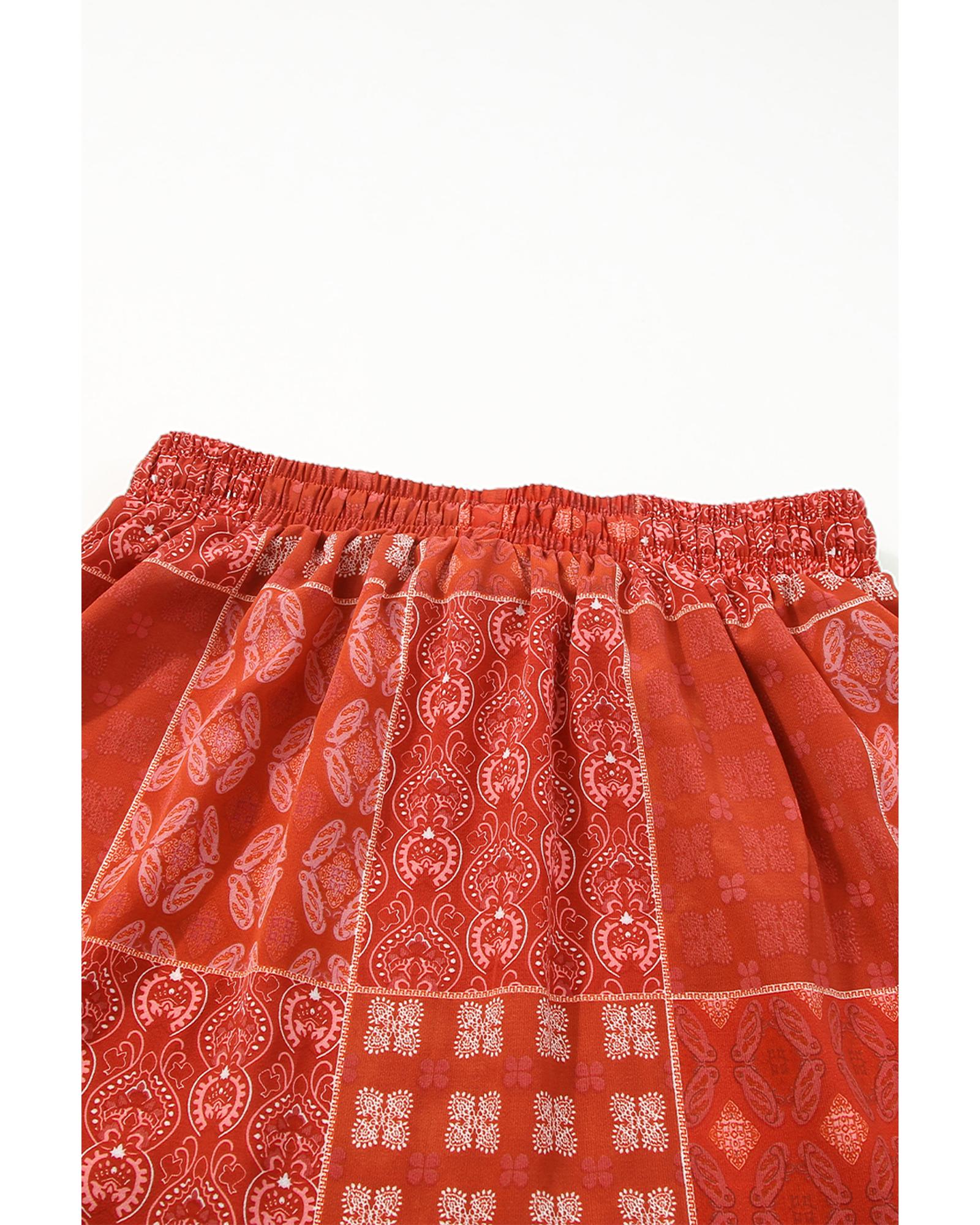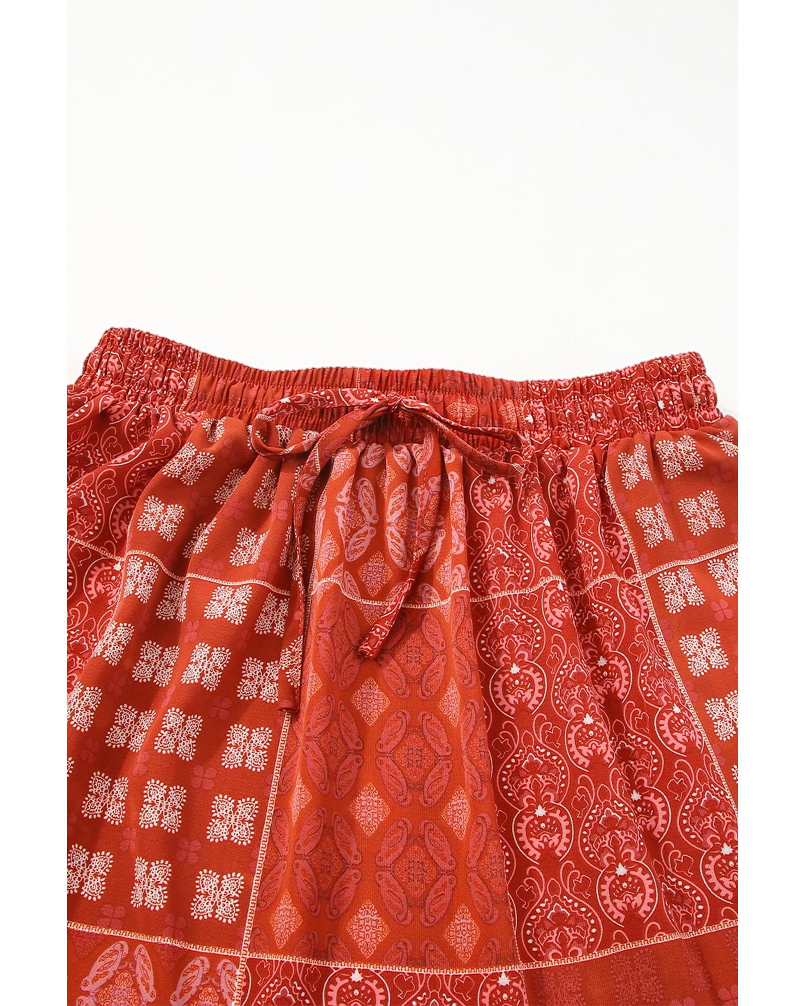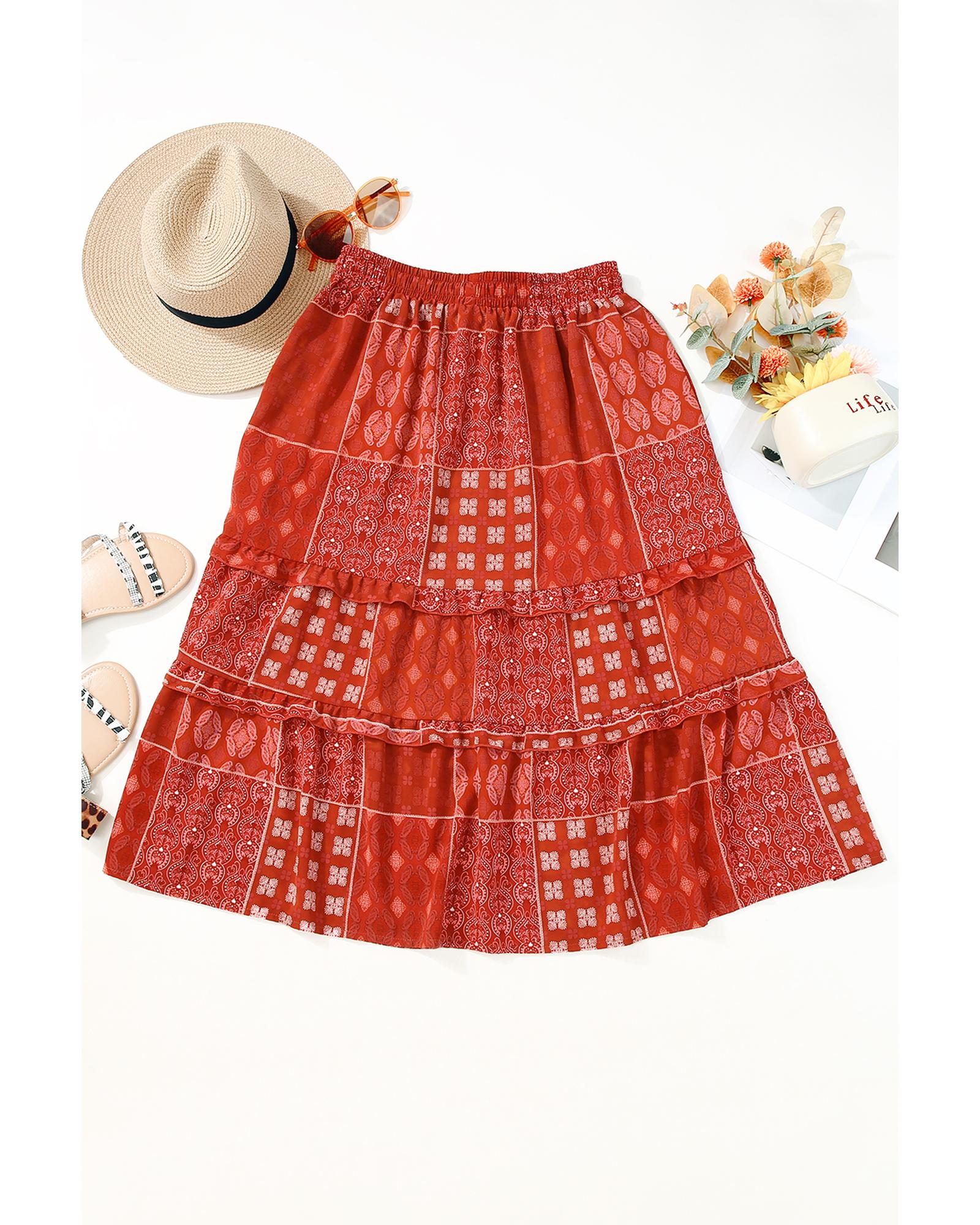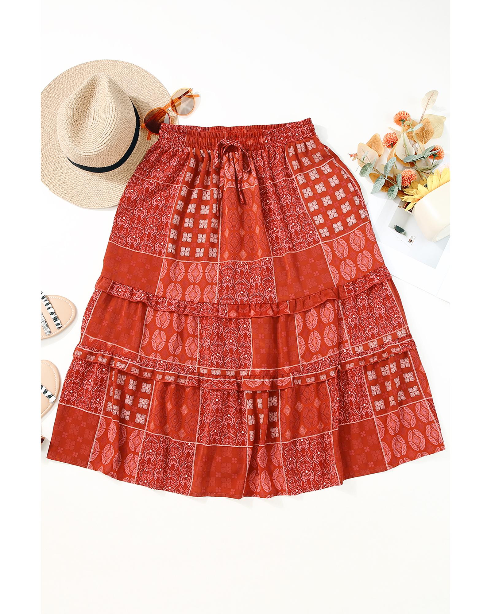 This long flared skirt features a vibrant bohemian print with a striking red pattern, offering a chic and trendy look. Its A-line silhouette and delicate ruffled details add a touch of elegance, making it suitable for various occasions. Crafted from lightweight and breathable polyester, it is ideal for hot weather or tropical travel. The versatile design pairs well with casual tops or dressier pieces to elevate your wardrobe.