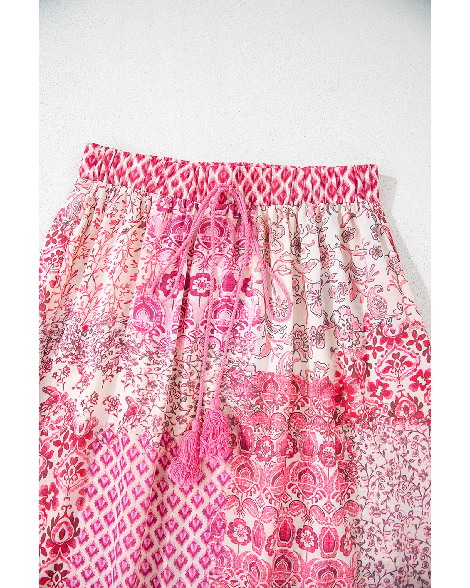 Red Boho Pattern Print Tassel Drawstring High Waist Maxi Dress – S