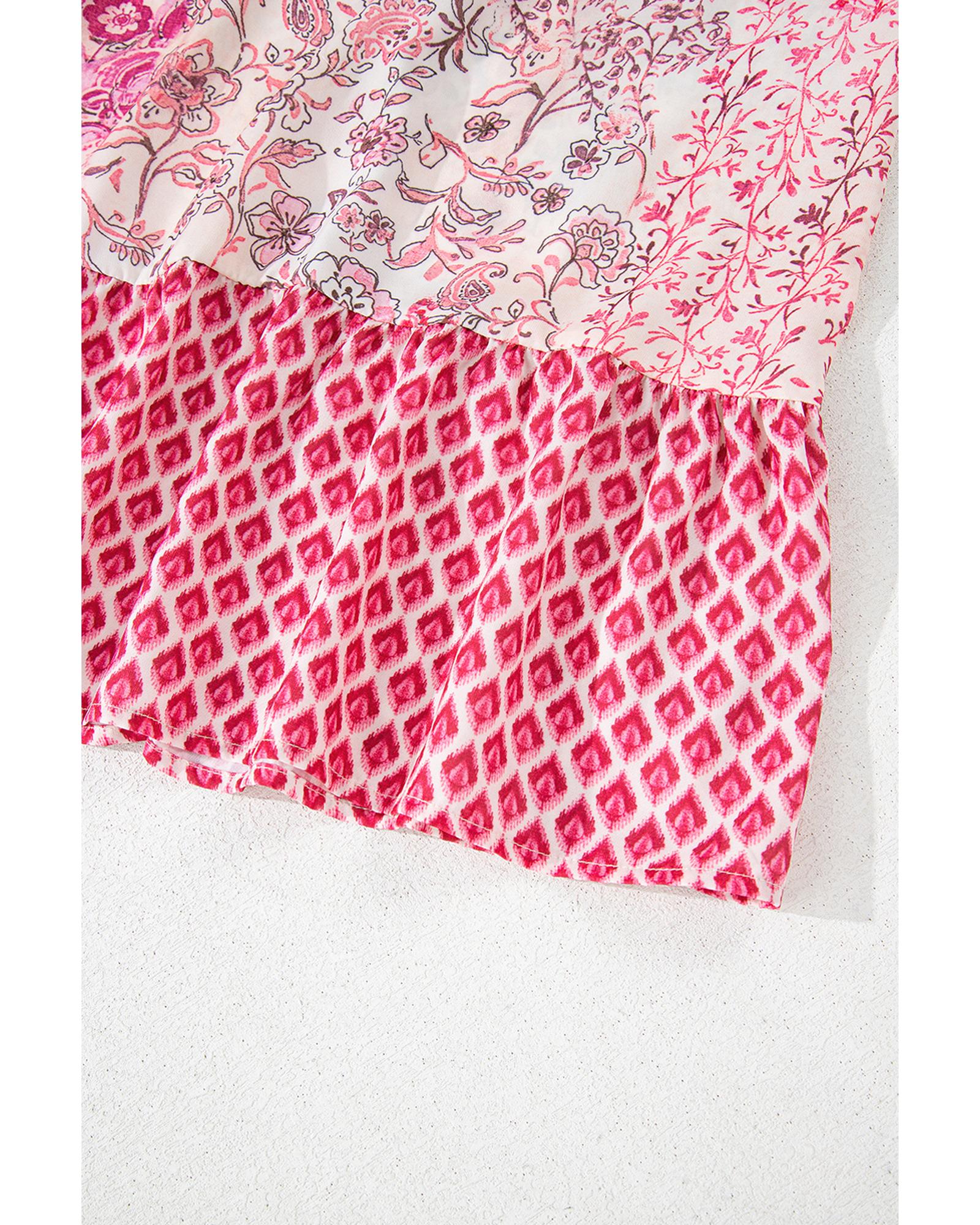 This maxi dress features a vibrant boho pattern with playful patchwork details. It is designed with a high waist and a tassel drawstring, creating a flattering silhouette. The ruffled hem adds a touch of femininity, while the soft lightweight fabric ensures comfort for all-day wear.