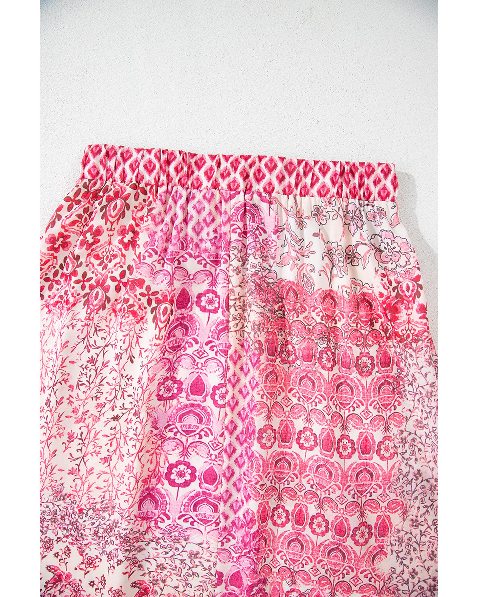 This maxi dress features a vibrant boho pattern with playful patchwork details. It is designed with a high waist and a tassel drawstring, creating a flattering silhouette. The ruffled hem adds a touch of femininity, while the soft lightweight fabric ensures comfort for all-day wear.