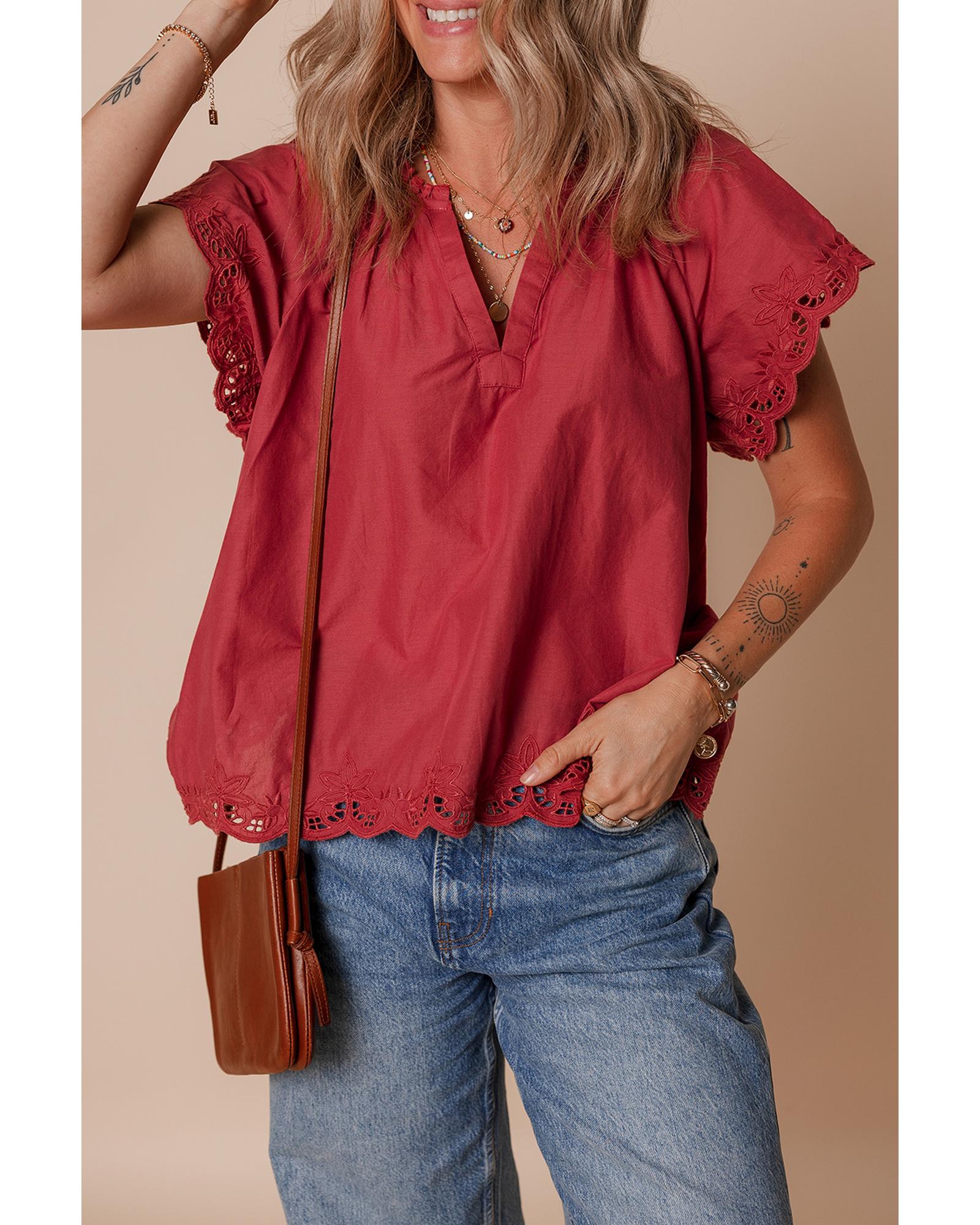 Red Dahlia Floral Embroidered Scallop Trim Short Sleeve V Neck Blouse – L