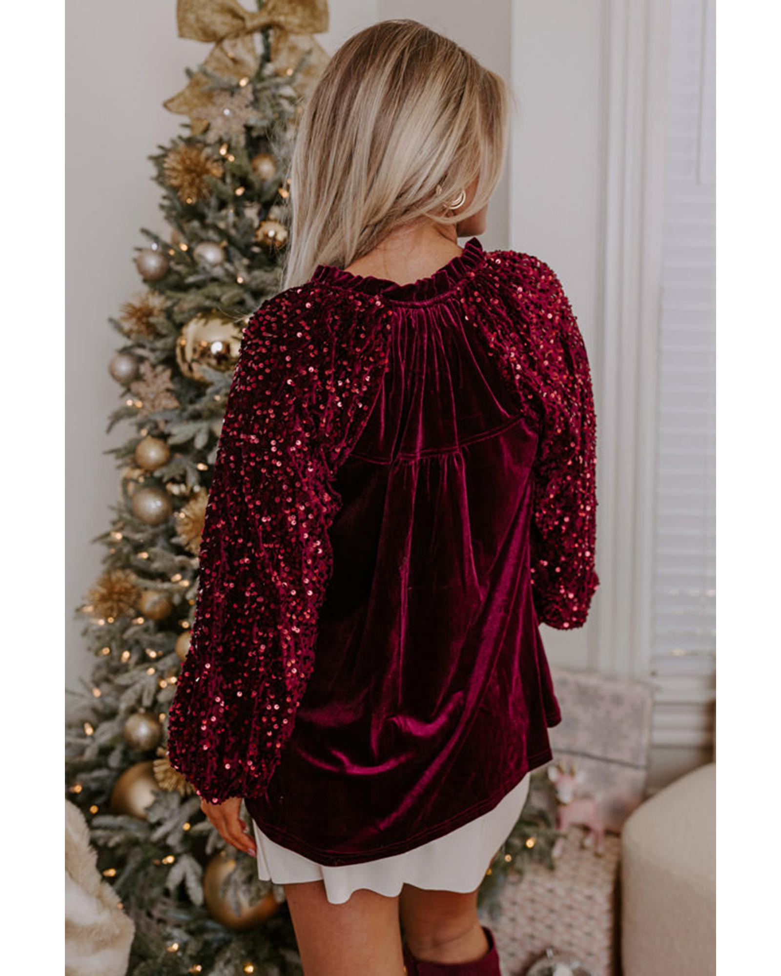 This velvet top features a stylish patchwork design with sequin accents on the sleeves, combining elegance with a trendy silhouette. It is designed to add a touch of sparkle to any outfit, making it suitable for various occasions.