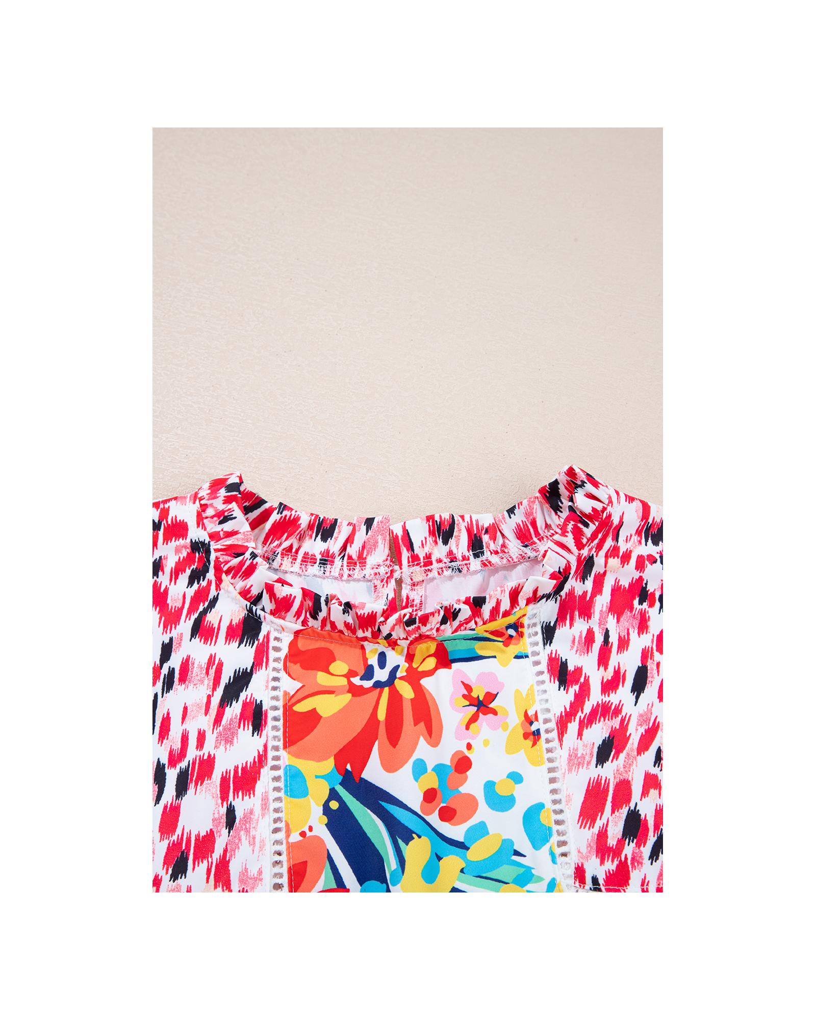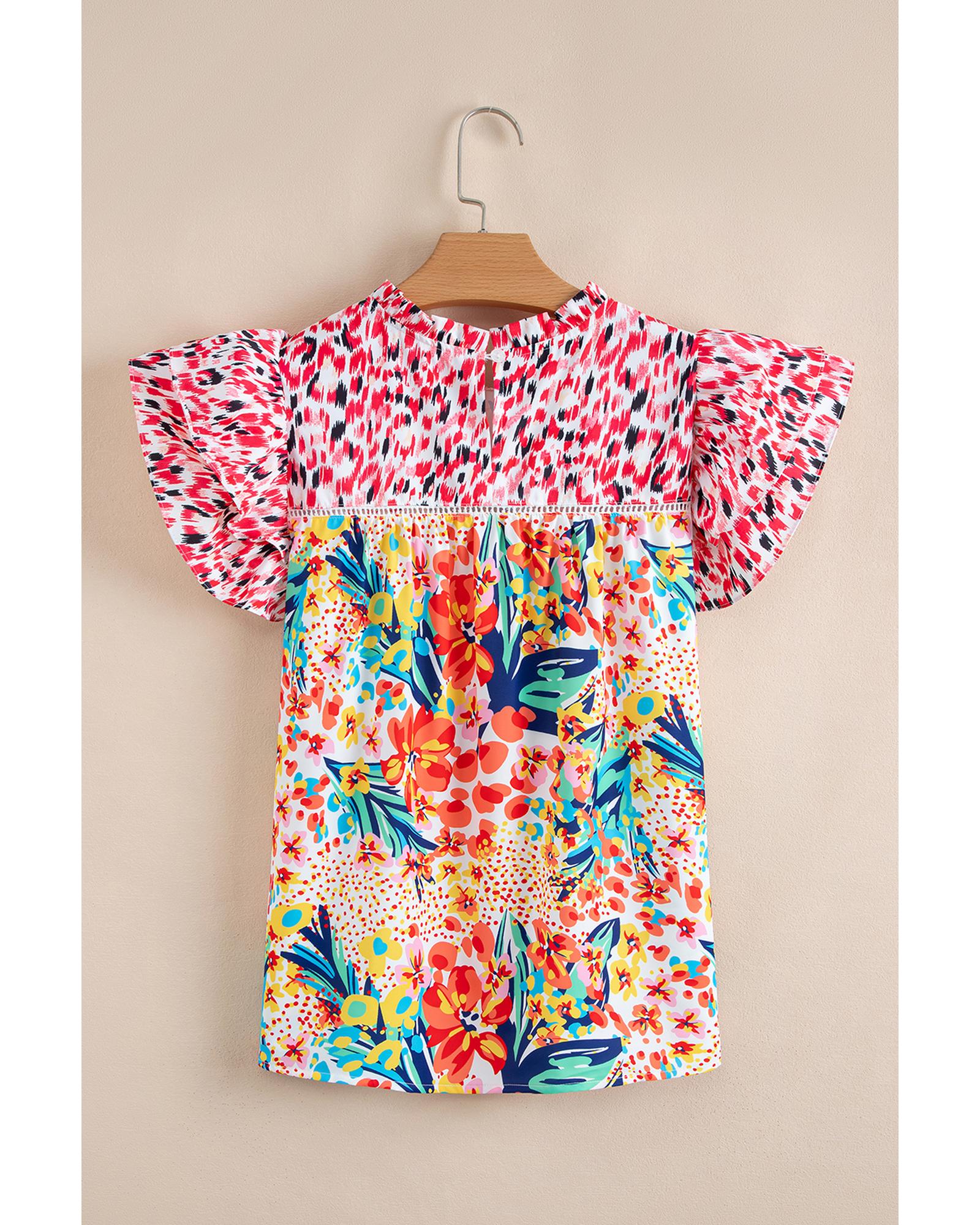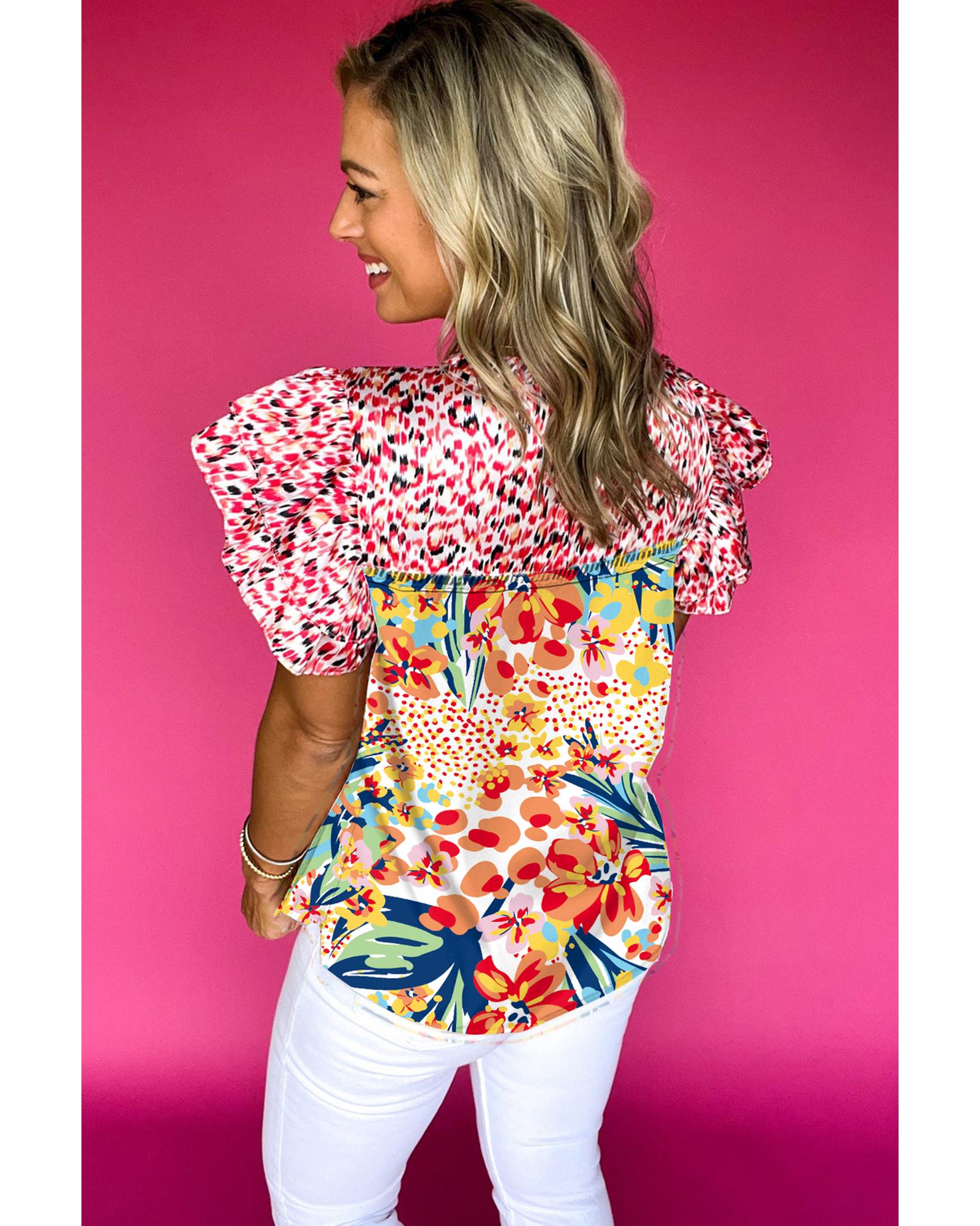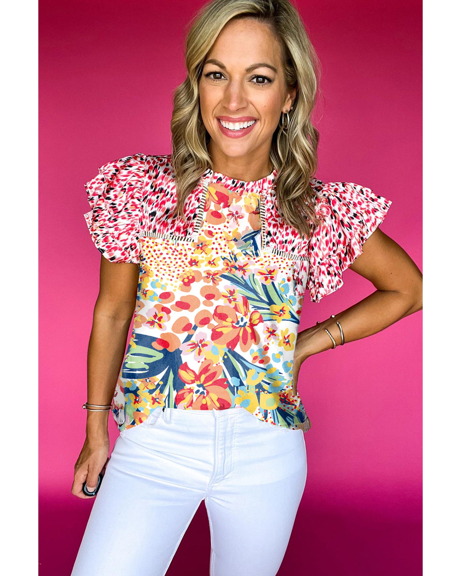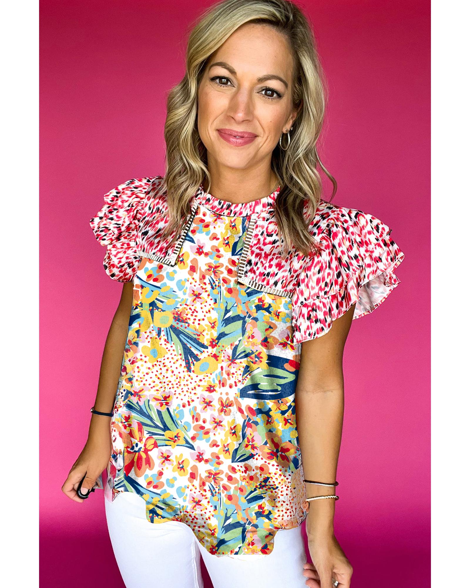This floral mixed print ruffle cap sleeve blouse offers a vibrant and stylish look with feminine details. Designed for comfort and versatility, it is suitable for everyday wear and can be paired with various bottoms for different occasions.