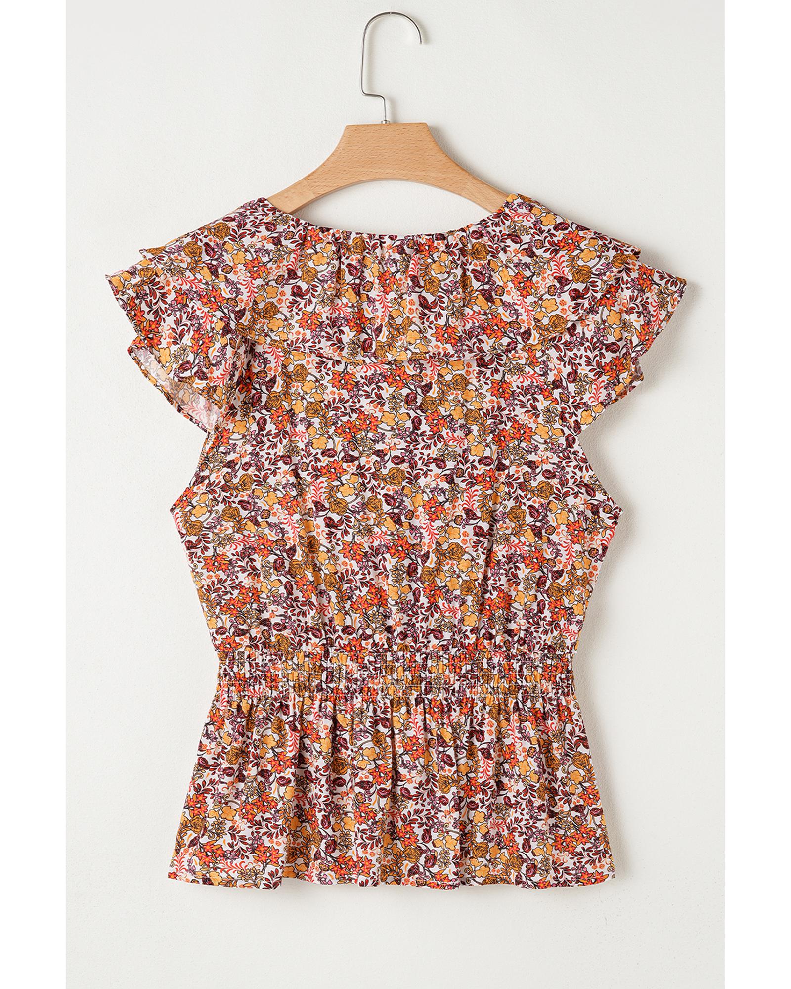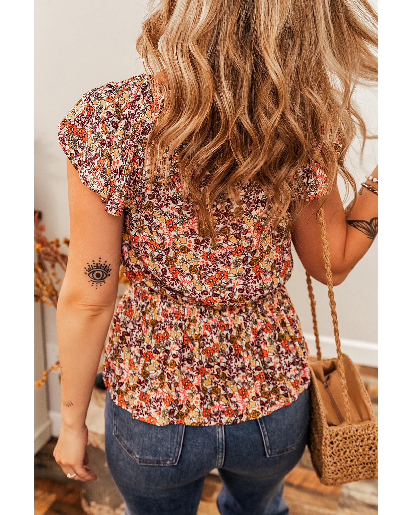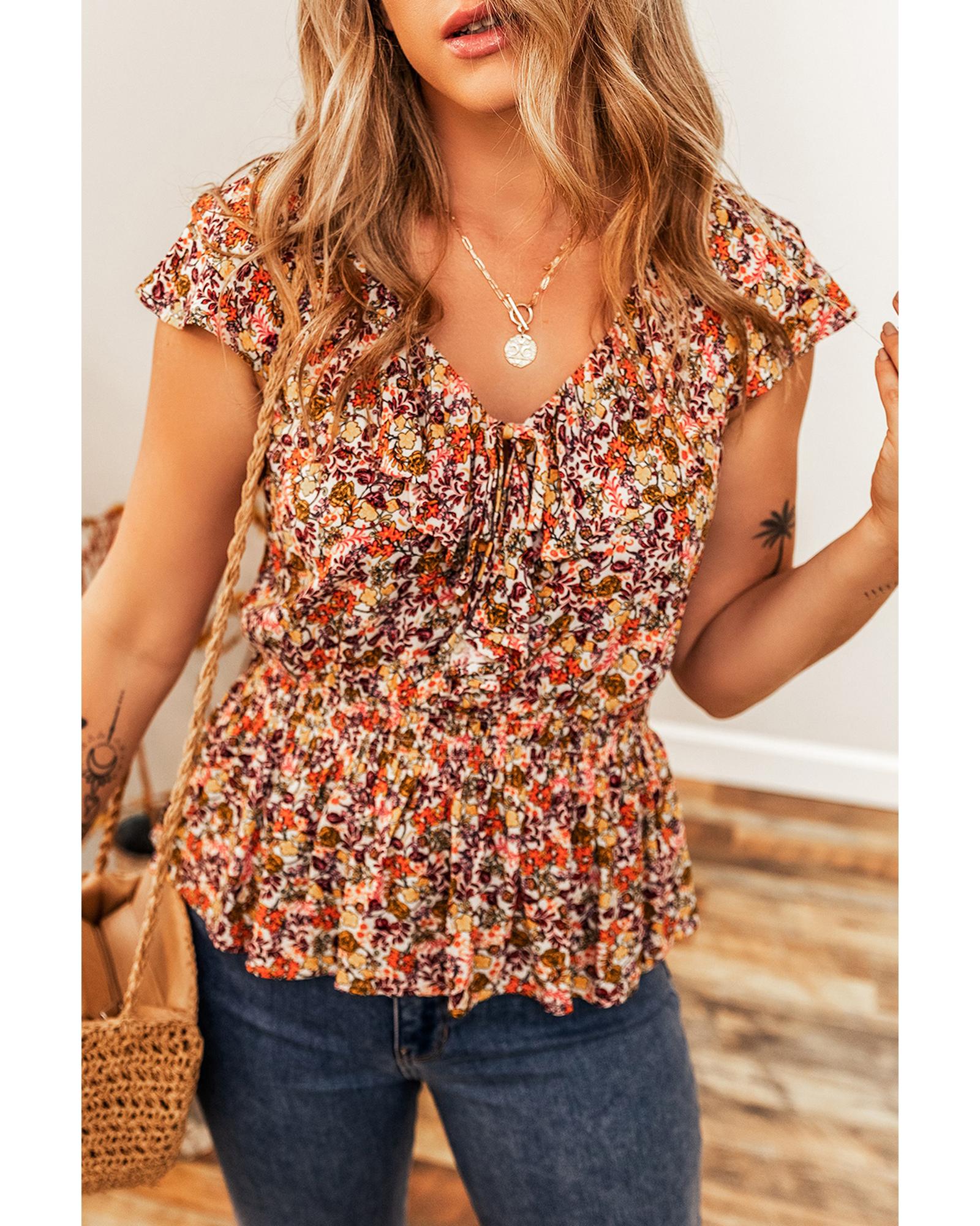 Red Floral Print Knot V Neck Ruffled Sleeve Blouse – XL
