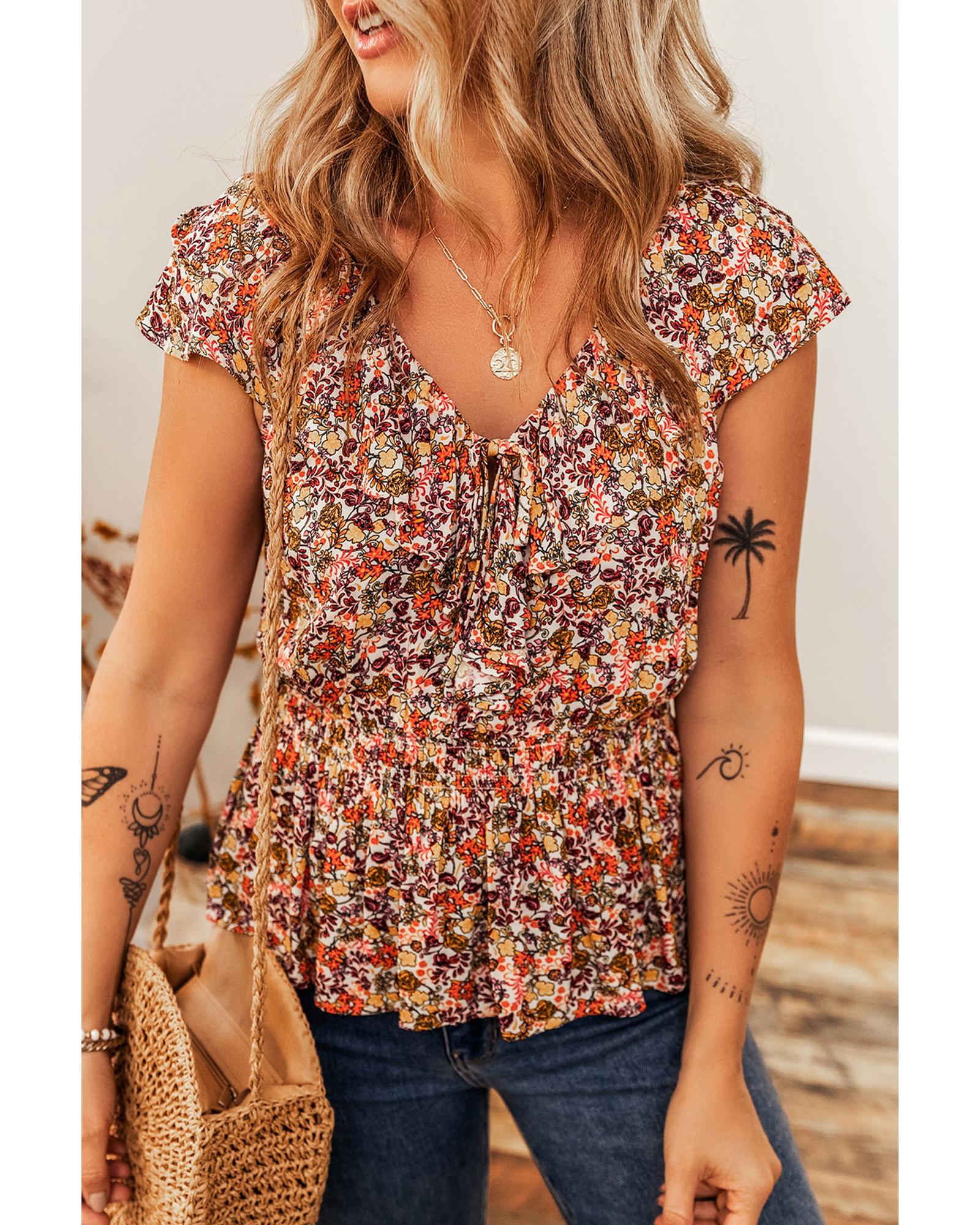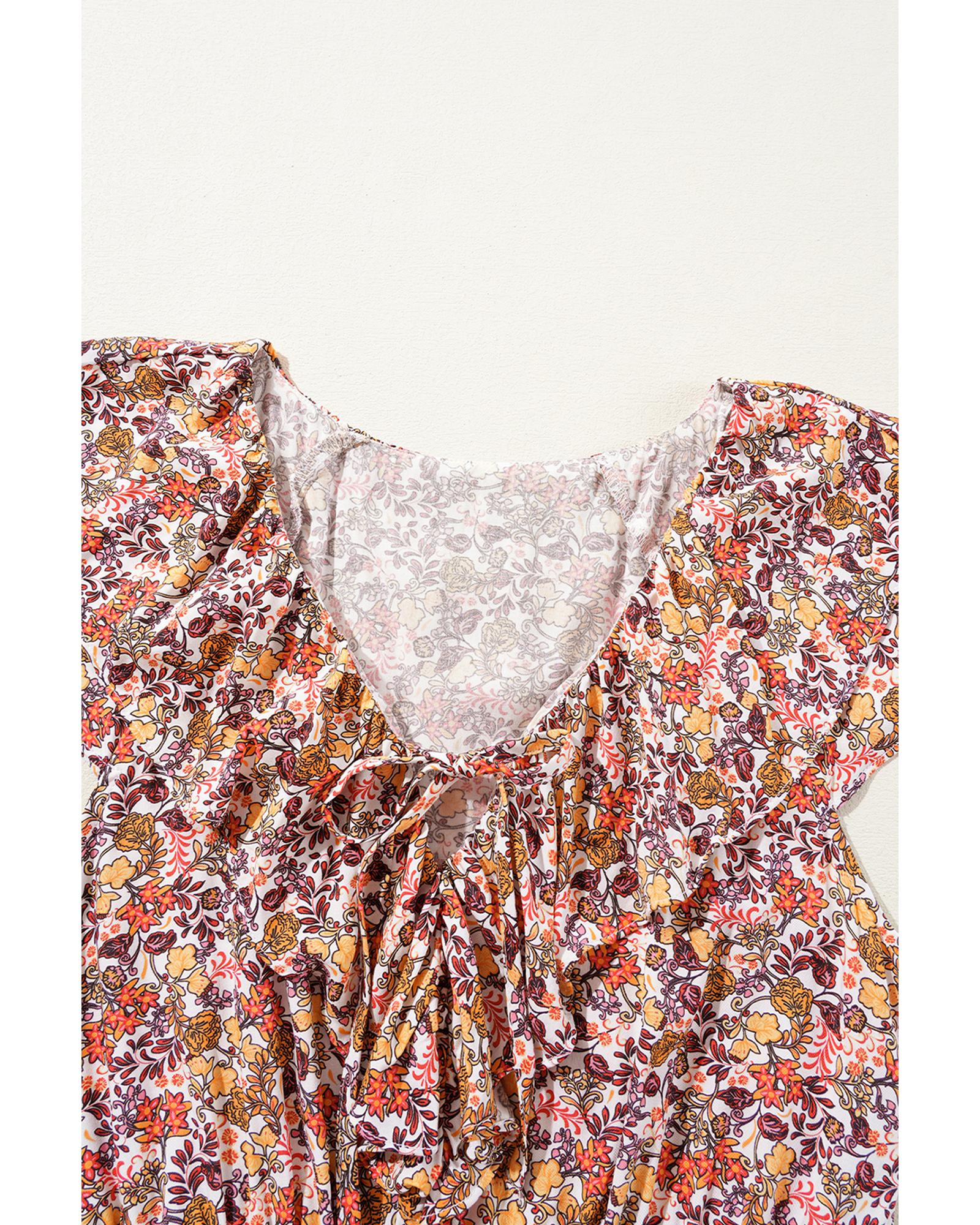 This blouse features a vibrant red floral print with stylish ruffled sleeves and a front knot detail, creating a playful and trendy look. The V-neck design enhances the neckline, making it suitable for various occasions. Crafted from lightweight and breathable viscose fabric, it offers comfort and elegance.
