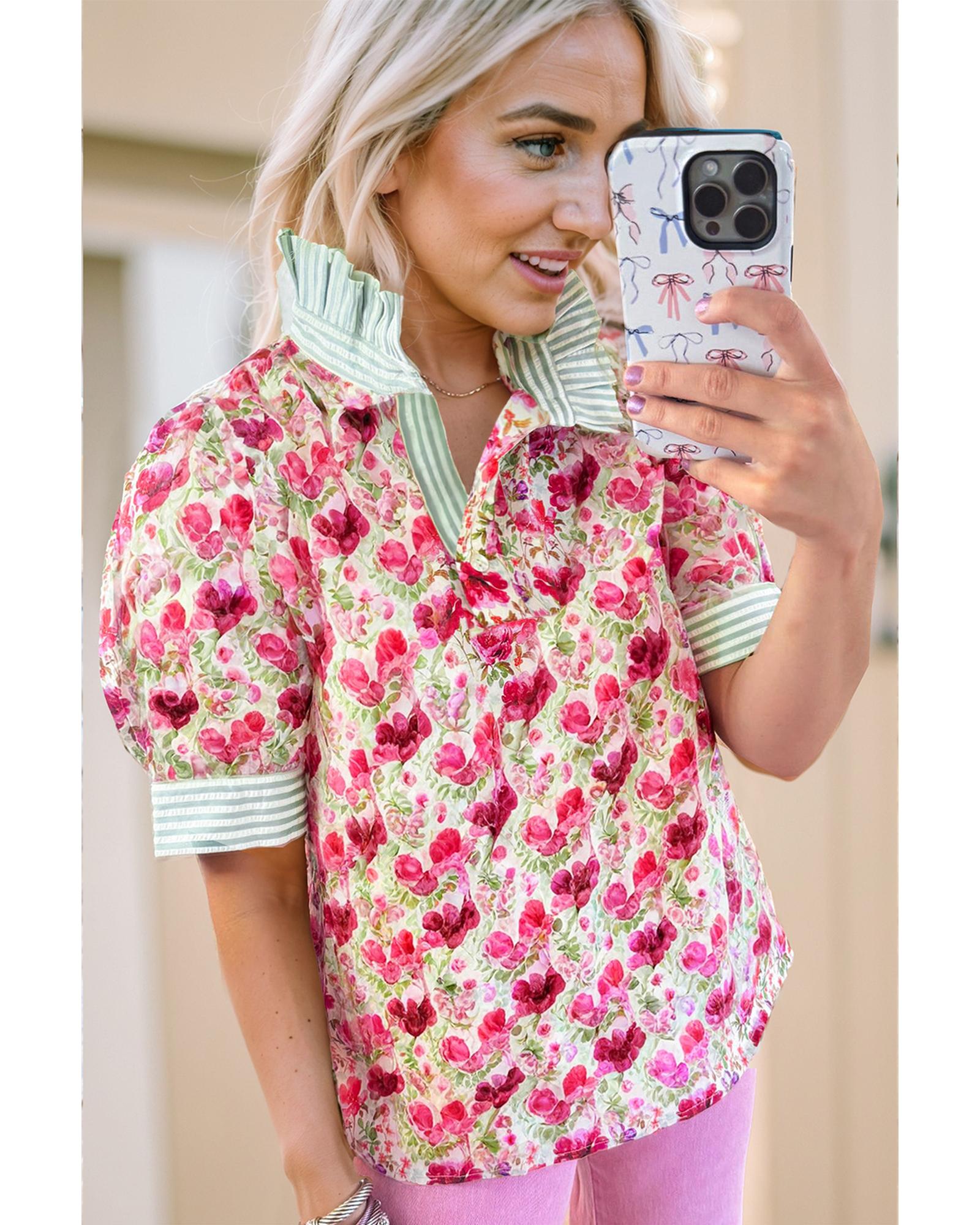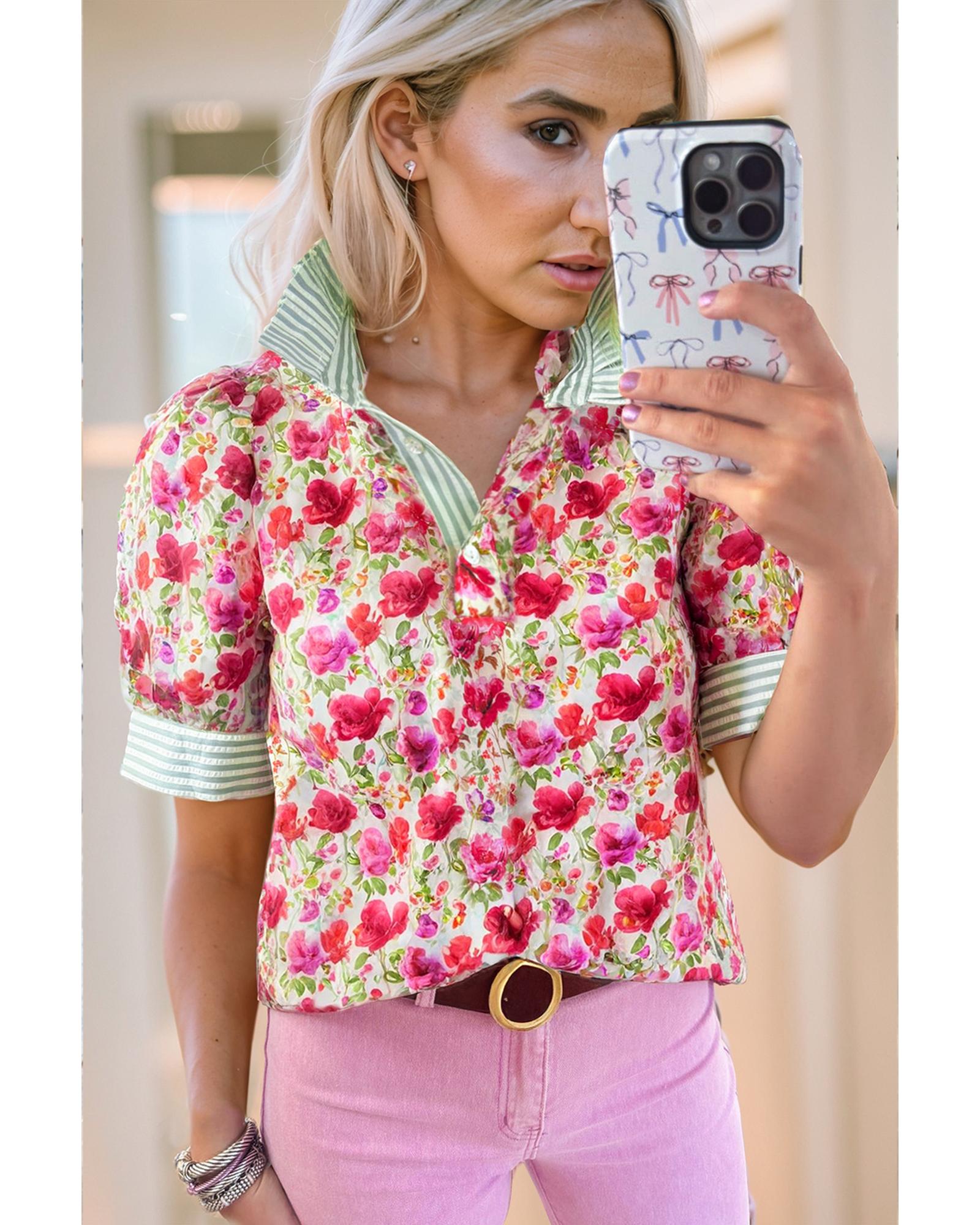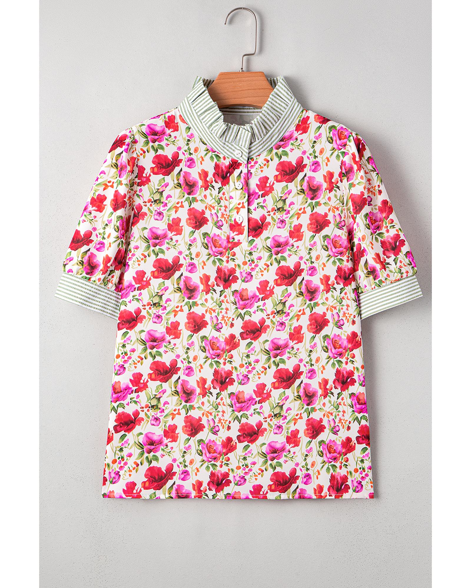 This blouse features a vibrant red floral print combined with striped patchwork, creating a stylish and eye-catching design. The collared neckline adds a touch of sophistication, while the short sleeves make it suitable for warm weather. Unique patchwork detailing enhances its trendy appearance, making it a versatile addition to your wardrobe.