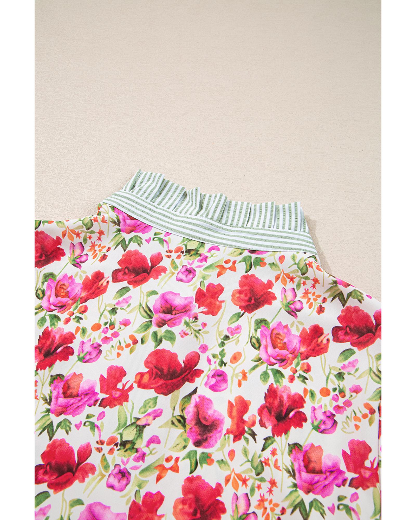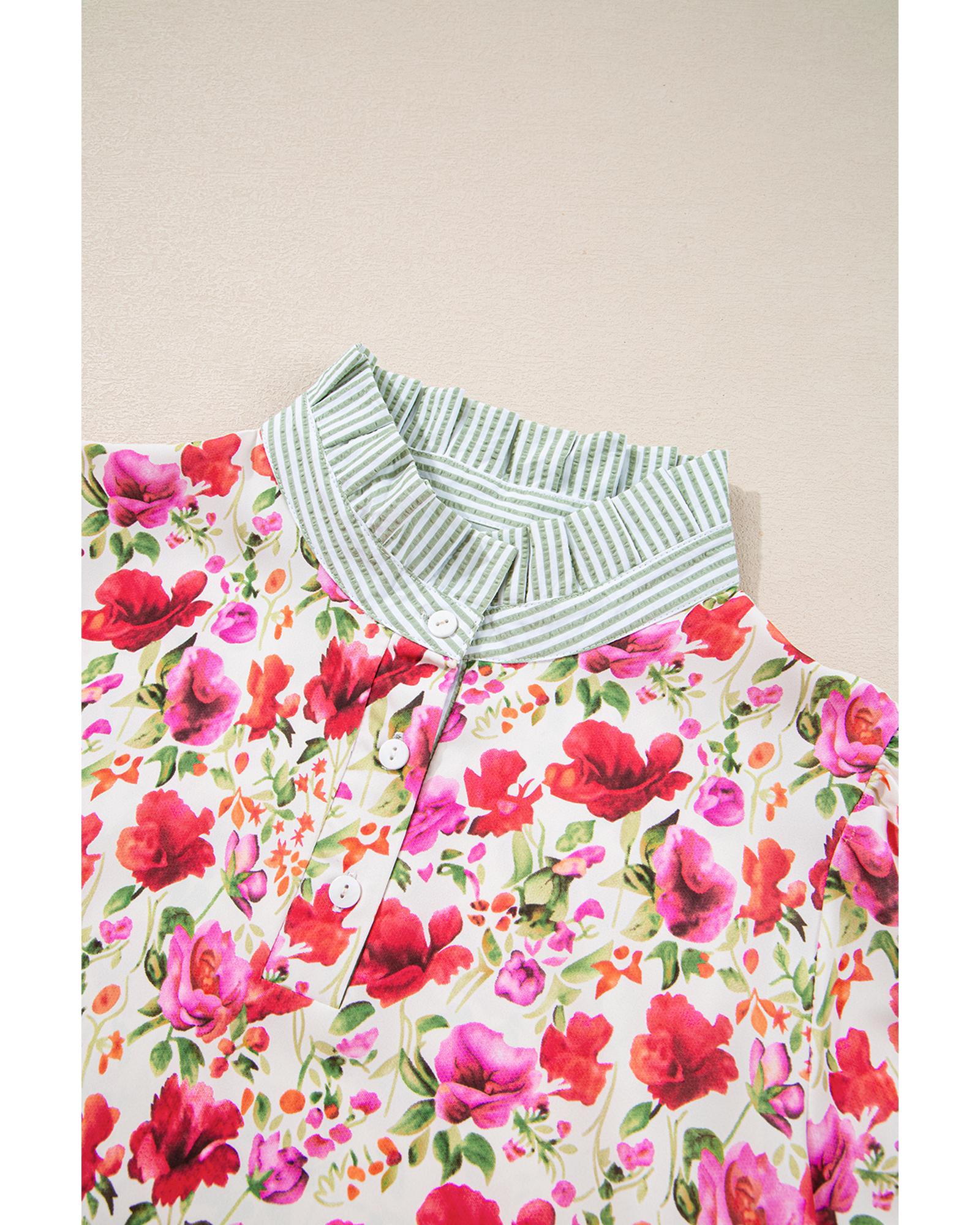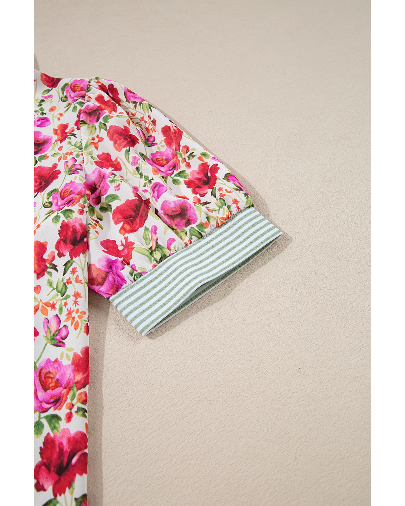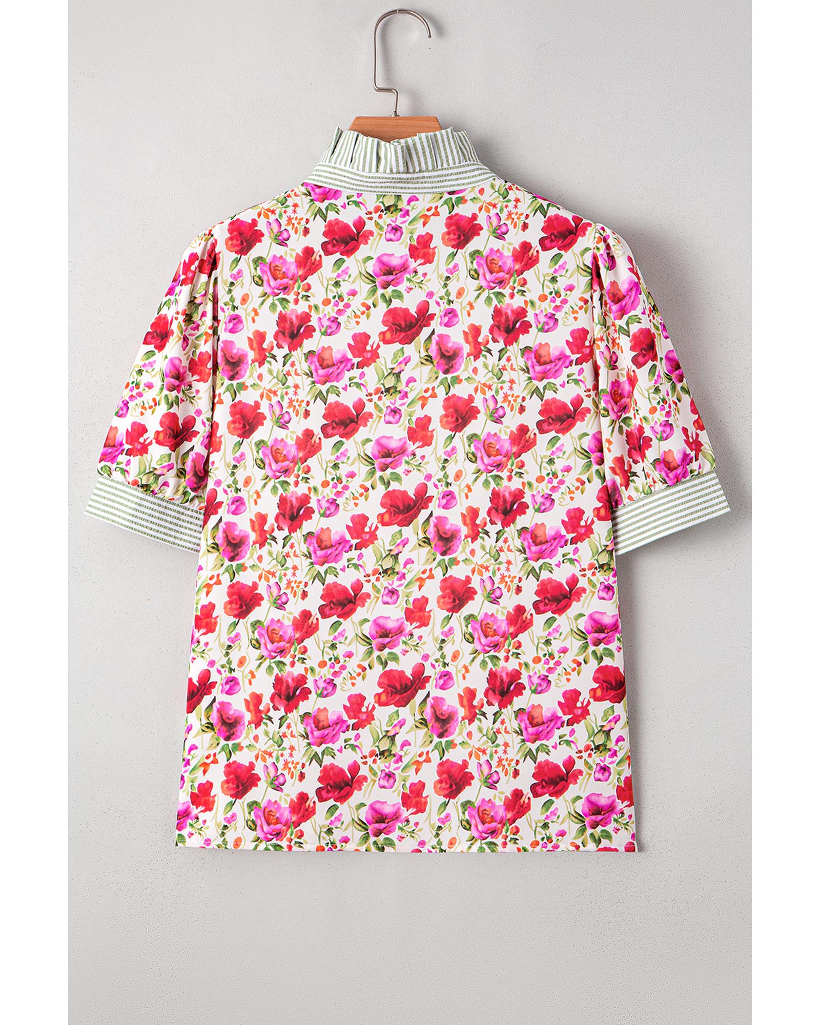 Red Floral Print Striped Patchwork Collared Short Sleeve Blouse – S