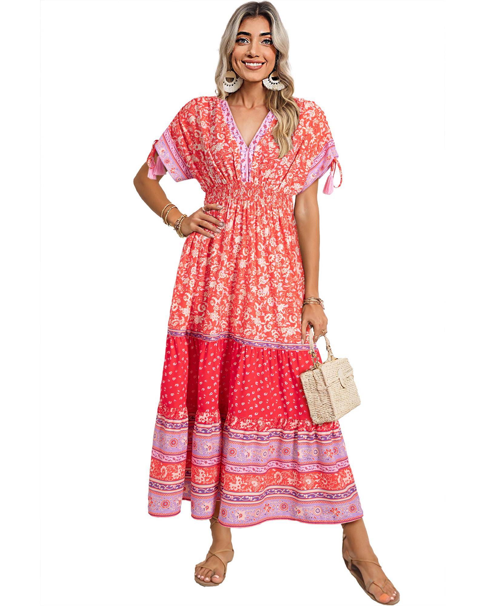 This maxi dress features a vibrant red floral print and a flowing silhouette, making it suitable for various occasions. The design includes tasseled tied sleeves and an empire waist that enhances a flattering shape. Crafted from lightweight polyester, it offers both comfort and style.