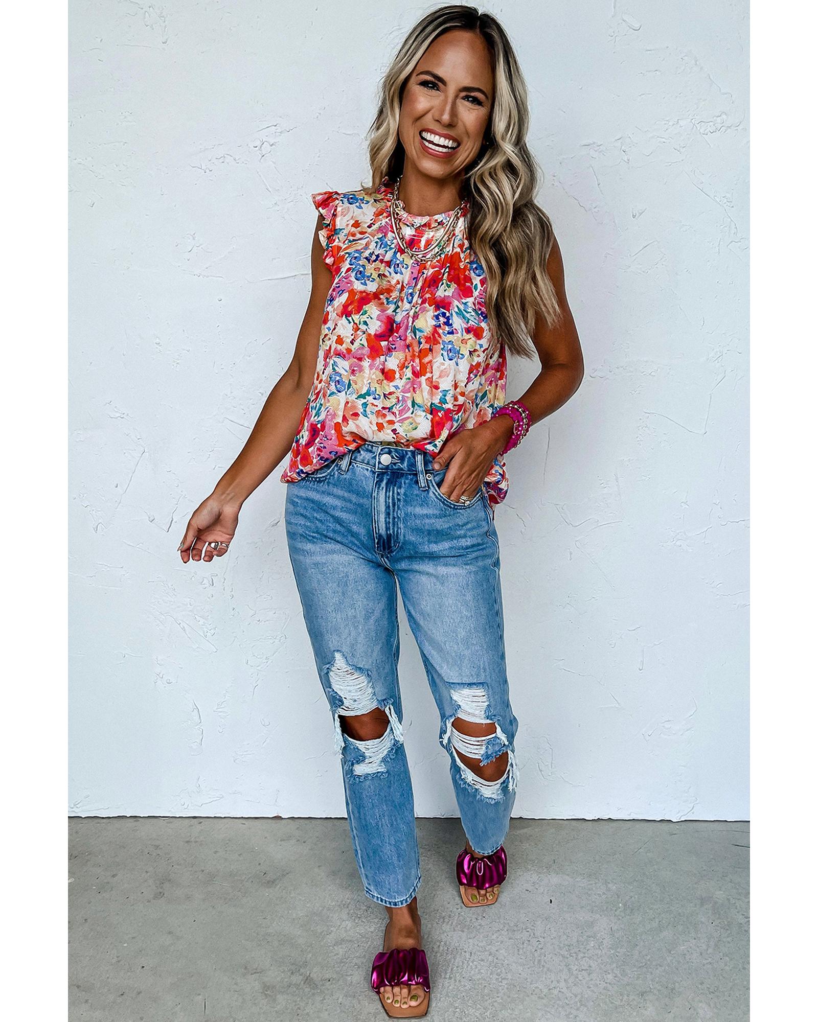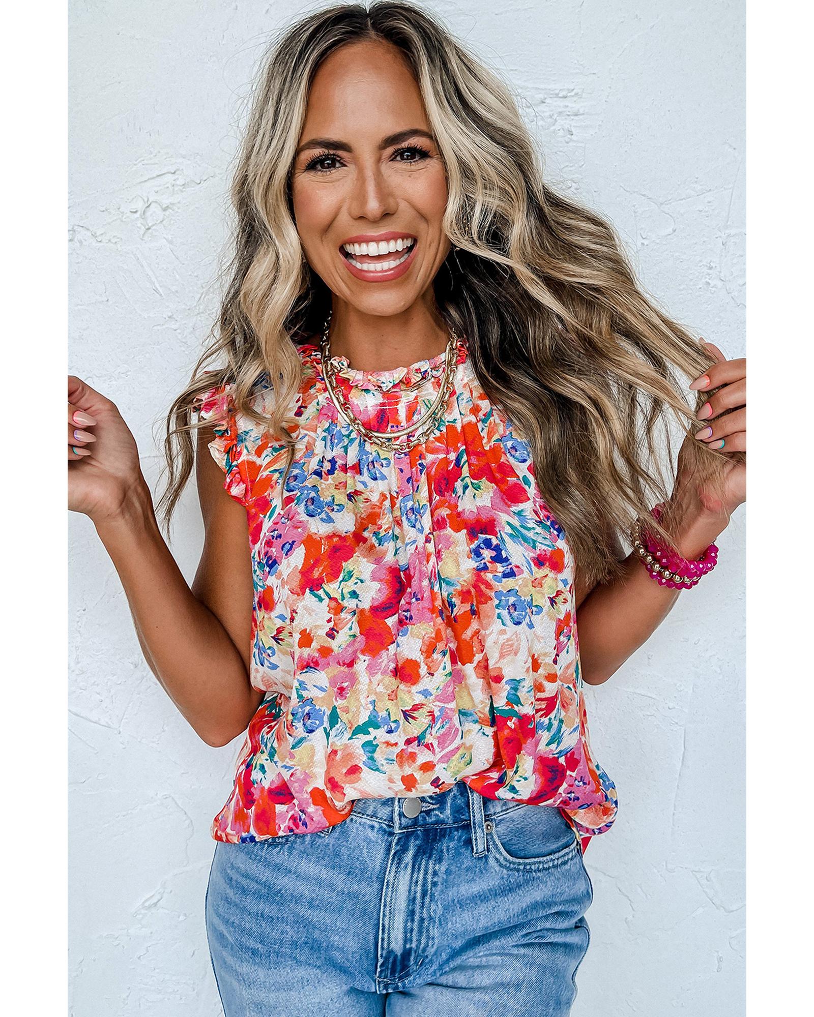 This stylish tank top features a vibrant floral pattern with a pleated design and a frilled neckline, offering a trendy and elegant look suitable for various occasions. Crafted with high-quality materials, it combines comfort and durability to ensure long-lasting wear.