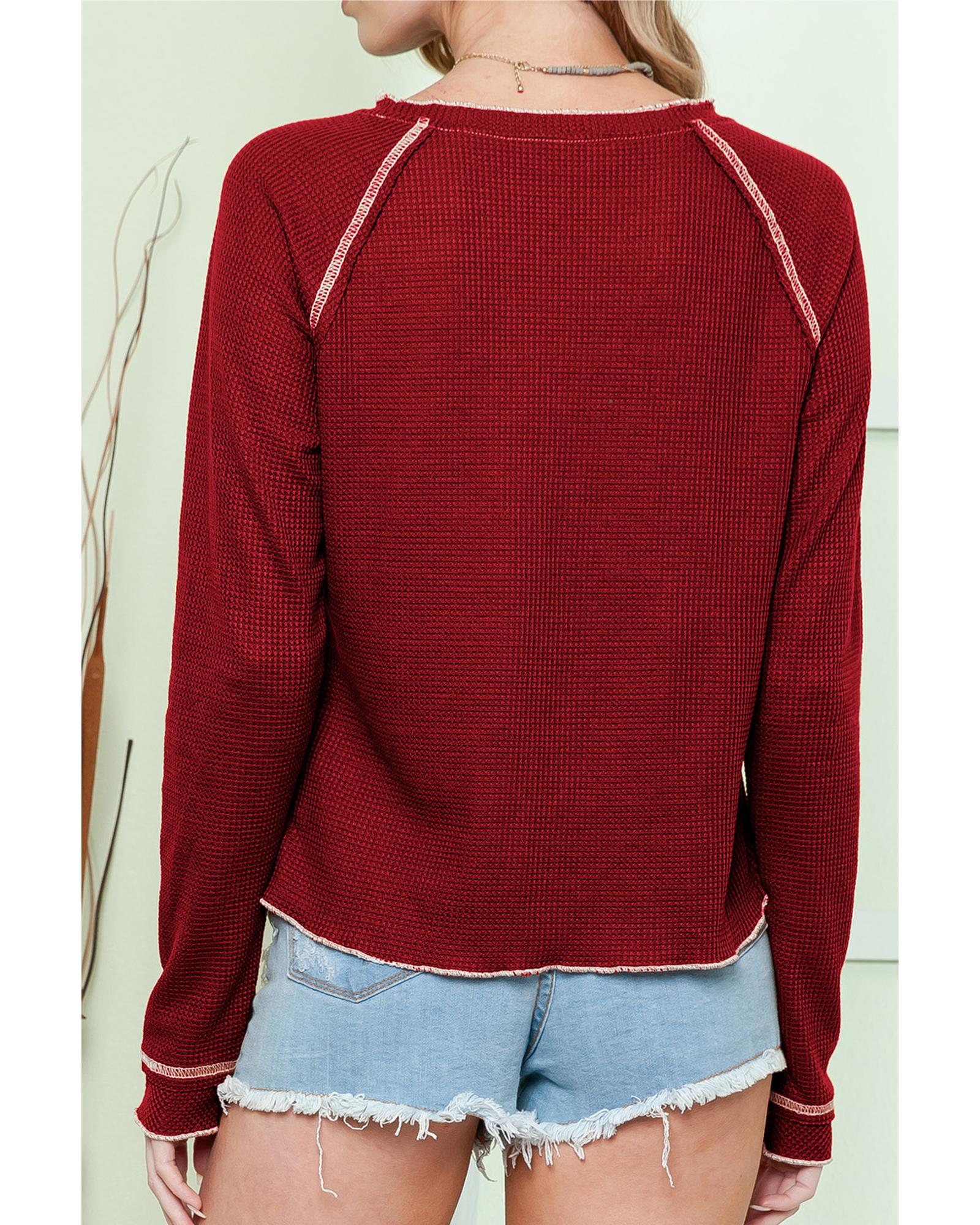 This thermal knit top features a vibrant red color and a rugby football graphic pattern, offering a stylish and sporty appearance. Designed with a fitted silhouette, it includes raglan sleeves for enhanced mobility and a comfortable fit, making it suitable for casual wear and outdoor activities.